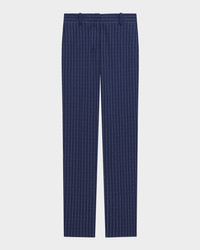 Theory's slimfit pants are crafted of pinstripe crepe and feature side slip pockets. Approx. 10.3" rise; 30" inseam; 39.5" outseam Midrise; sits high on the hip Fourpocket style Straight legs Full length Hook/zip fly; belt loops Viscose/elastane Dry clean Imported
