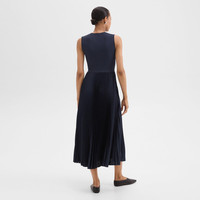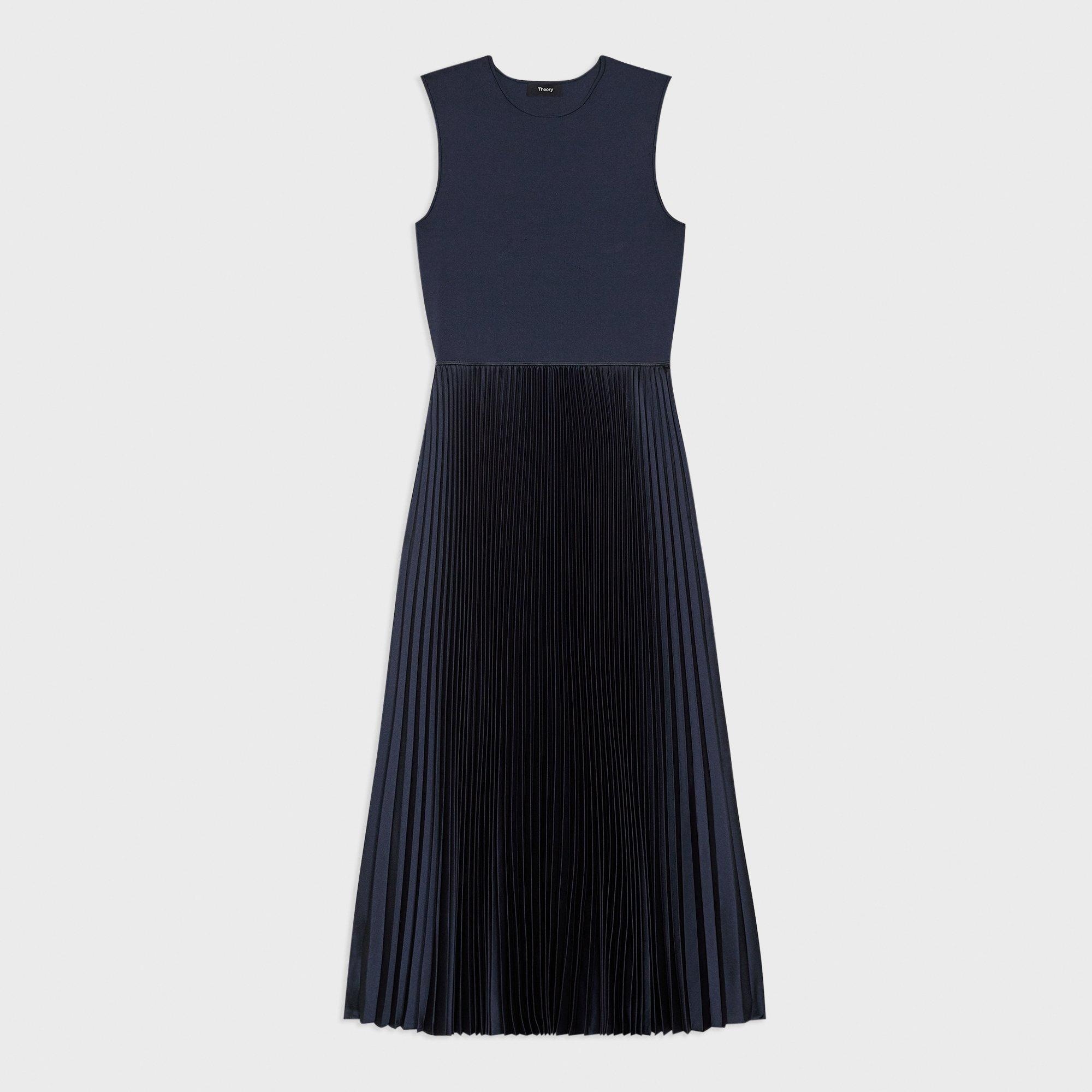 Pre-layered for a refined one-and-done combination, our sleeveless dress is detailed with a crewneck shell in rayon knit for a second-skin fit. Tailored with a pleated midi skirt that is constructed with our textured satin with a subtle sheen and luxurious hand-feel and woven from 100% post-consumer recycled polyester. Style #: O1005602 Fit True to size, choose your normal size Fit-and-flare silhouette, sleeveless Below-the-knee length Model is 5’11” and wearing a US size S Materials & Care Composition 100% recycled polyester Care Do not wash. Do not bleach. Do not tumble dry. Do not iron. Dry clean with any solvent except trichloroethylene. Imported