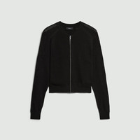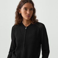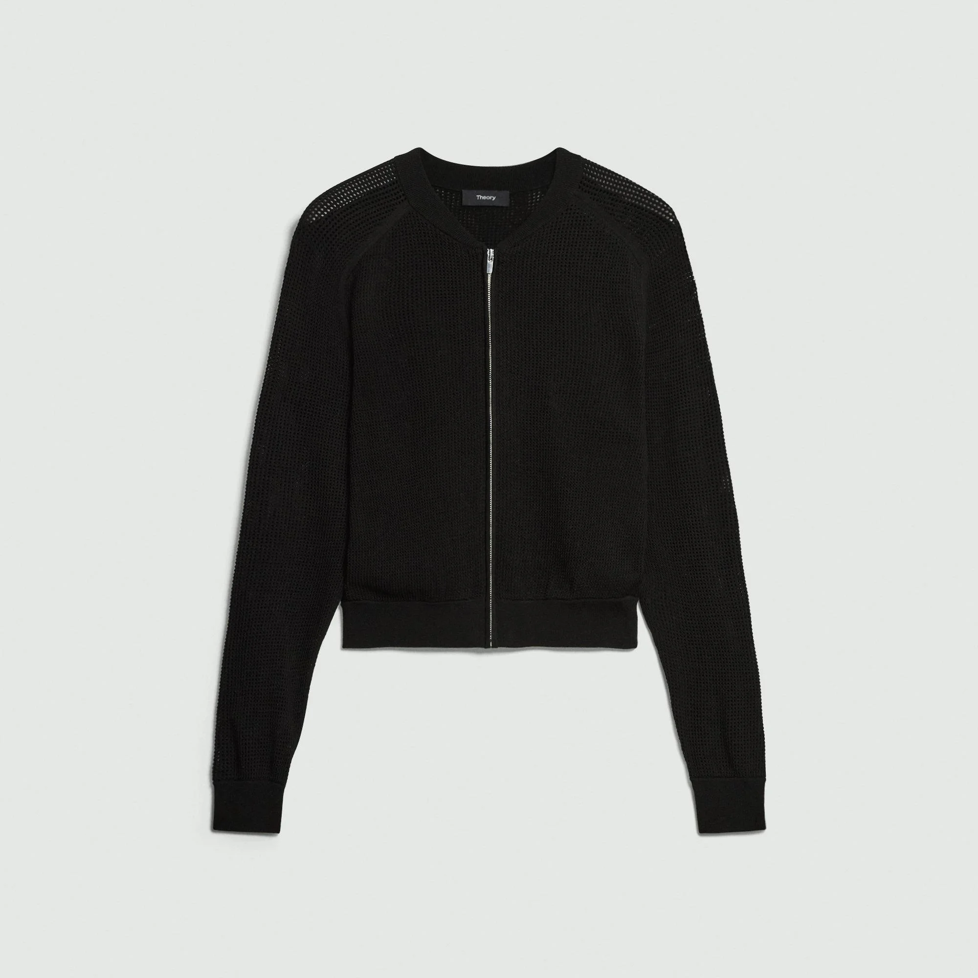 Please enter your email below to be notified when this item is in stock With a smooth and compact finish, this bomber jacket is knit with a pointelle stitch from viscose that is made with wood pulp sourced from certified responsibly managed forests. It features a stand collar, rib-knit trim, and an exposed front zip closure. Style #: P0416708 Please enter your email below to be notified when this item is in stock Fit True to size, choose your normal size Relaxed fit, long sleeves Short length Materials & Care Composition 83% viscose 17% polyester; exclusive of elastic Care Hand wash cold. Do not bleach. Lay flat to dry in shade, do not tumble dry. Cool iron if needed. Dry clean with any solvent except trichloroethylene. Imported