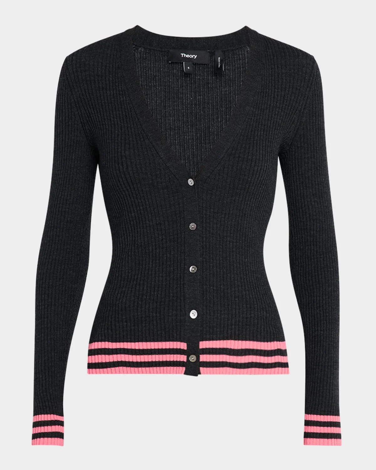 - A slim V-neck cardigan in rib with contrast stripe detail at the bottom hem and cuffs. It can be worn as a set with a rib scoop-neck shell. - Theory ribbed regal merino wool cardigan with contrast trim - V neckline - Long sleeves - Slim fit - Hem sits at the hip - Button-front - Wool - Dry clean - Imported