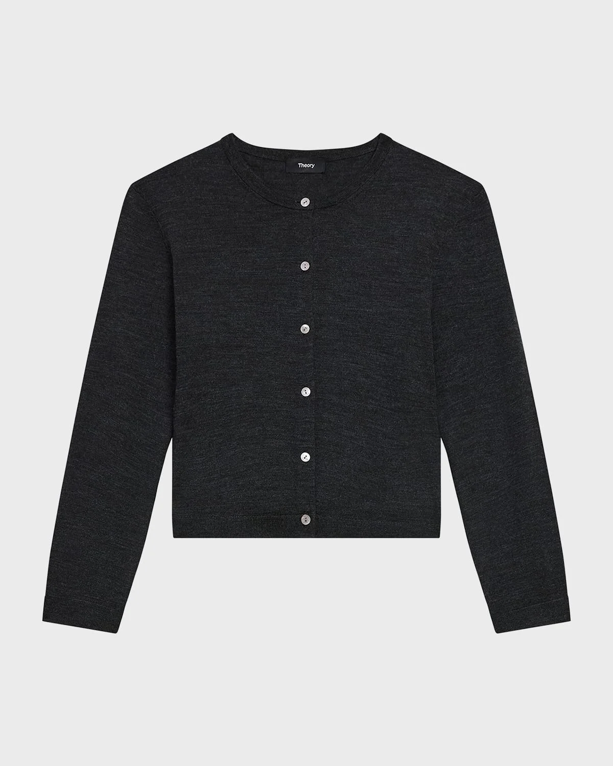 Theory classic cardigan finished with pearlescent buttons Crew neckline; button front Long sleeves Ribbed cuffs and hem Cropped length Slim fit Merino wool Dry clean Imported