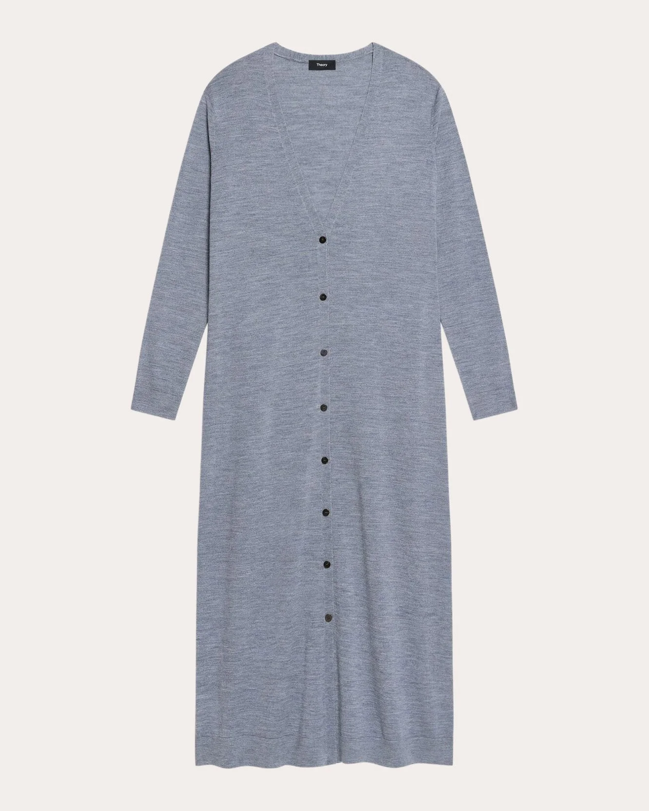 Endlessly versatile, this duster-length cardigan is crafted from Theory's signature Regal Wool. Rib knit trim creates a clean finish. Designer color: light heather gray Button closure Contrast rib trim 100% merino wool Dry clean Made in China Size & Fit Garment measurements (size S): 47.5in long from high point of shoulder to hem, 36in bust, 36in waist Fits true to size Please note, below measurements reflect Theory's size chart, not the actual garment. Size P (XS): 31-32in bust, 24.5-25.5in waist, 34.25-35.25in hips Size S: 33-34in bust, 26.5-27.5in waist, 36.25-37.25in hips Size M: 35-36in bust, 28.5-29.5in waist, 38.25-39.25in hips Size L: 37.5-39in bust, 31-32.5in waist, 40.75-42.25in hips