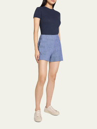 A clean short with a side zip closure, on-seam pockets, welt pockets at the back, and crisp seamed creases at the front and back. Theory lightweight denim shorts Approx. 3.25" inseam High rise Side seam pockets; back welt pockets Relaxed fit Side zip Linen/viscose/elastane Dry clean Imported Online Inquiries: BGS21_T6H7S| Store Inquiries: #4986434