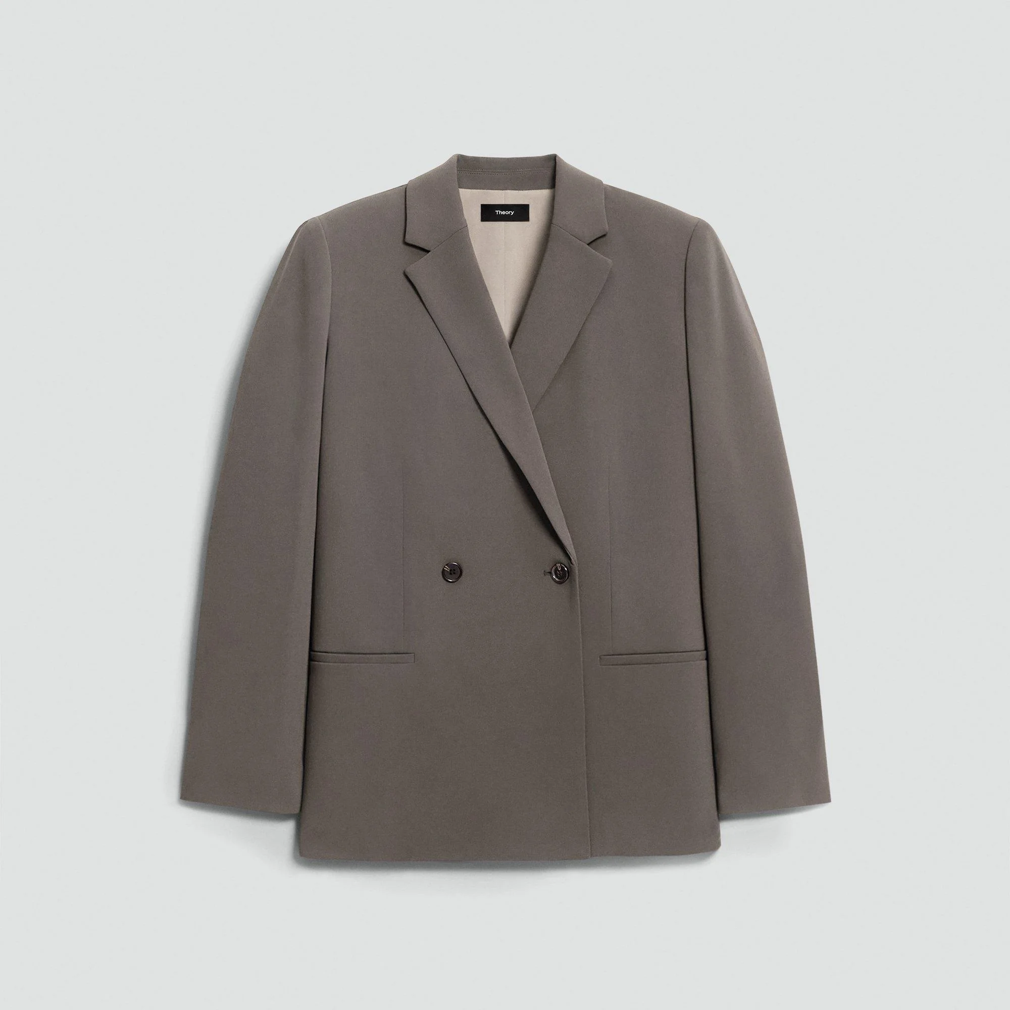 Please enter your email below to be notified when this item is in stock This double-breasted blazer is tailored with relaxed proportions and a clean, softly defined drape. Cut from Japanese Admiral Crepe and finished with notch lapels and welt pockets. It’s a sharp layer that moves seamlessly from desk to dinner. Our signature crepe is woven with triacetate, a fabric made of wood pulp sourced from certified responsibly managed forests. Style #: P0109115 Please enter your email below to be notified when this item is in stock Fit True to size, choose your normal size Relaxed fit, bracelet-length sleeves Regular length Model is 5’11” and wearing a US size 2 Materials & Care Composition 70% triacetate 30% polyester Care Do not wash. Do not bleach. Do not tumble dry. Cool iron if needed. Dry clean with any solvent except trichloroethylene. Imported