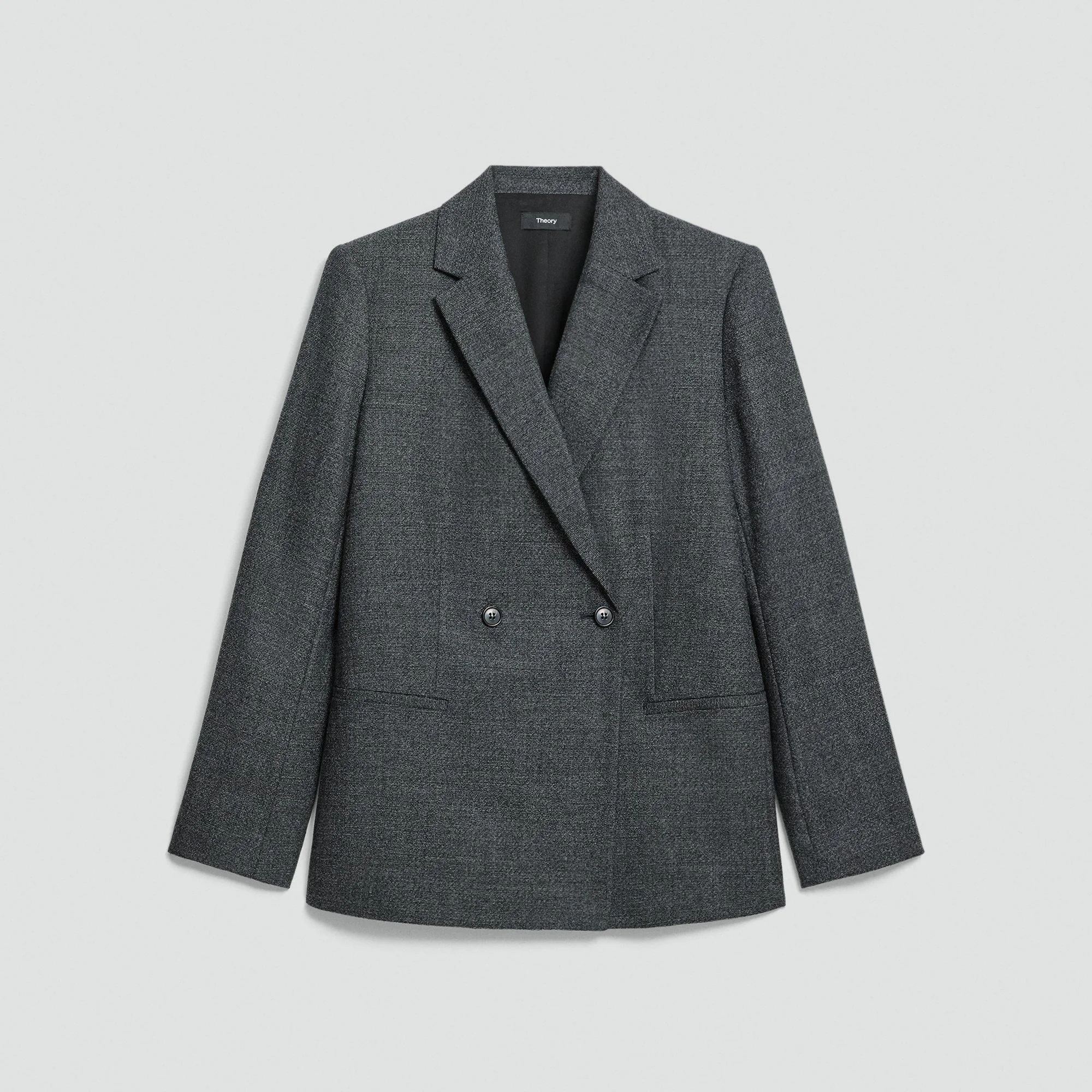 Please enter your email below to be notified when this item is in stock This double-breasted blazer is tailored with relaxed proportions and a clean, softly defined drape. An extension of our Sleek Flannel, the fabric is crafted from soft, lightweight Italian wool. It has a polished look with a subtle twisted pattern. This wool is traceable to the certified responsibly managed Malahide farm in Tasmania, Australia, and is consciously woven by the Botto Giuseppe mill in Biella, Italy. Style #: P0801128 Please enter your email below to be notified when this item is in stock Fit True to size, choose your normal size Regular length Model is 5’11” and wearing a US size 2 Materials & Care Composition 100% virgin wool Care Do not wash. Do not bleach. Do not tumble dry. Warm iron if needed. Dry clean with any solvent except trichloroethylene. Imported