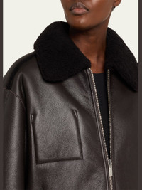 This coat from Theory features a reversible design crafted of dyed lamb shearling (Italy) and smooth leather, showcasing a cozy cocoon silhouette with ample pockets. Spread collar Long sleeves with button cuffs Chest pocket Side slip pockets Oversized fit Two-way zip-front Shearling Dry clean Imported Online Inquiries: BGS21_T862P| Store Inquiries: #5242922