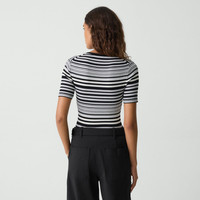 Our elevated approach to a ribbed tee is cut for a fitted shape with bold stripes and a pair of short sleeves. Finished with a crew neckline, it’s crafted in a fine-gauge merino wool from Australia that’s spun and knit in Italy. This single-origin sourced wool is fully traceable to Congi Farm, located in Woolbrook, New South Wales, Australia. This luxury yarn is produced by Botto Giuseppe, a forward-thinking mill and leader in sustainability, located in Biella, Italy. Style #: P0111704 Fit True to size, choose your normal size Fitted, short sleeves Hip length Model is 5’11” and wearing a US size S Materials & Care Composition 100% wool; exclusive of elastic Care Do not wash. Do not bleach. Do not tumble dry. Cool iron if needed. Dry clean with any solvent except trichloroethylene. Imported