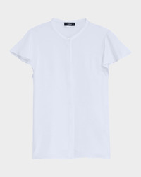 - Theory silken shirt framed by ruffle sleeves - Band collar; hidden button placket - Short flutter sleeves - Relaxed fit - Hip length - Silk - Imported - Fashioned for change: responsible manufacturing. Find out more - here