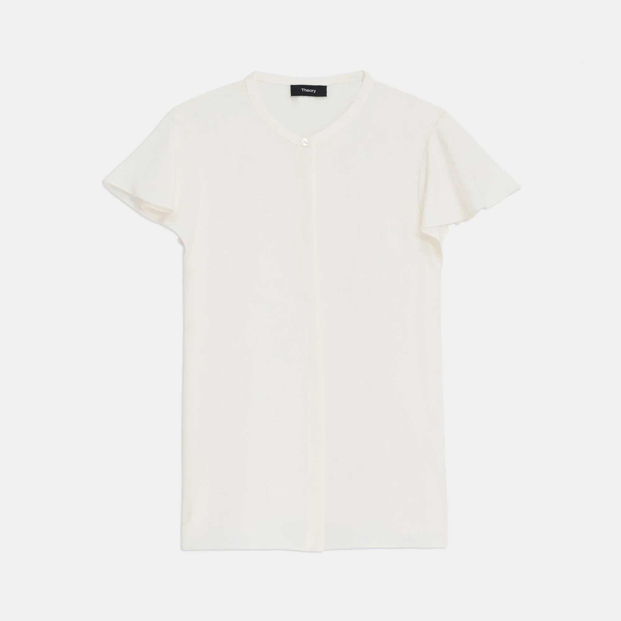 Tailored along a collarless silhouette, our top is ruffled along short sleeves. This relaxed style is crafted in a lightweight, airy silk georgette. Our silk georgette is MADE IN GREEN by OEKO-TEX® certified. All products with this certification are made without harmful chemicals, in environmentally and socially responsible facilities. Each component of the garment, the factory, and the mill have been certified by OEKO-TEX®. Style #: N0102531 Fit True to size, choose your normal size Relaxed fit, short sleeves Hip length Model is 5’11” and wearing a US size S Materials & Care Composition 100% silk Care Do not wash. Do not bleach. Do not tumble dry. Cool iron if needed. Dry clean with any solvent except trichloroethylene. Imported