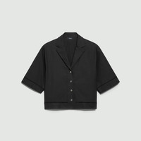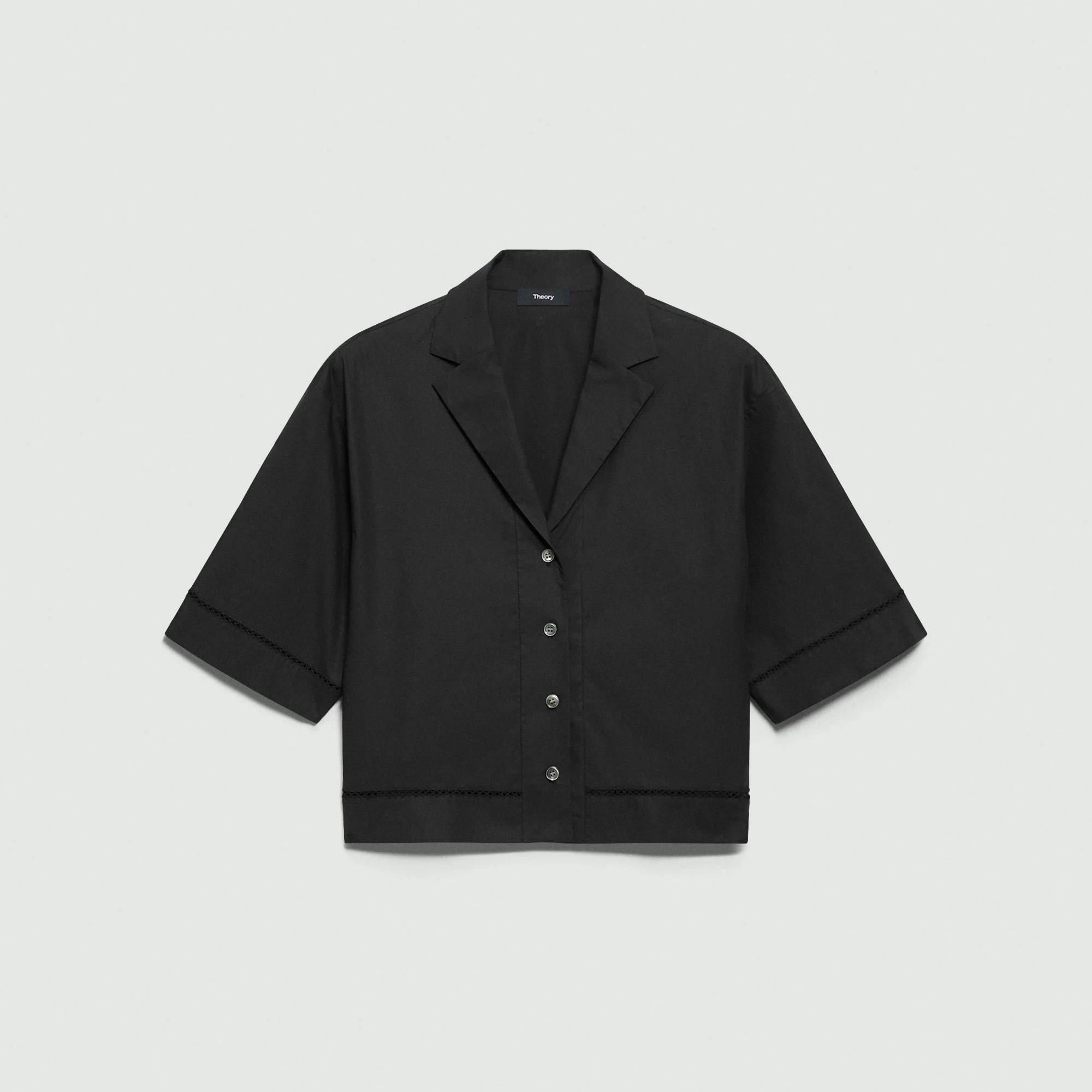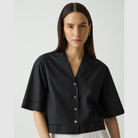 Please enter your email below to be notified when this item is in stock Cut for an oversized fit, this button-up shirt features a lapel-inspired camp collar, dropped shoulders, and a slightly cropped silhouette. It’s made of a stretch cotton poplin fabric that is woven in Turkey by a leading cotton mill. Style #: P0504509 Please enter your email below to be notified when this item is in stock Fit True to size, choose your normal size Oversized fit, elbow-length sleeves Cropped length Model is 5’11” and wearing a US size S Materials & Care Composition 96% cotton 4% elastane Care Do not wash. Do not bleach. Do not tumble dry. Cool iron if needed. Dry clean with any solvent except trichloroethylene. Imported