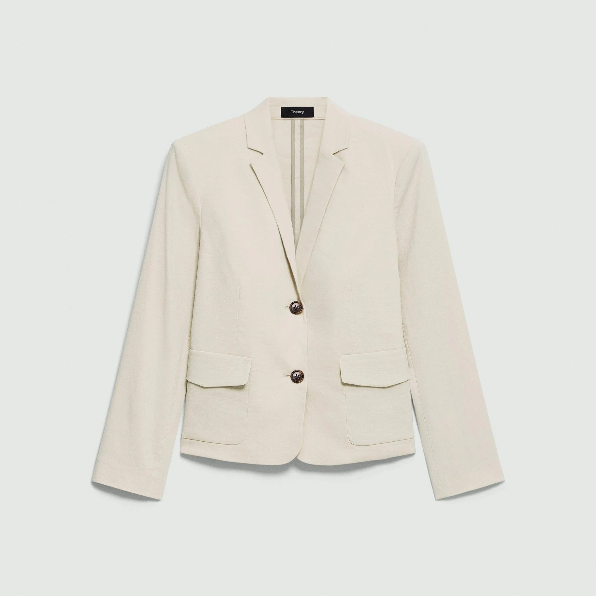 Please enter your email below to be notified when this item is in stock Defined by its shrunken slim fit, this tailored blazer features notched lapels, side patch pockets, and a two-button closure. Crafted from our signature stretch Good Linen fabric, this single-breasted style is a warm-weather everyday favorite. Theory for Good Woven by the Marini & Cecconi Mill in Prato, Italy, Good Linen is our signature stretch linen fabric, made up of three fibers— flax sourced from France, viscose made from repurposed cotton fiber waste, and certified recycled elastane for stretch. Learn more about our Good Linen. Style #: P0203106 Please enter your email below to be notified when this item is in stock Fit True to size, choose your normal size Slim fit, bracelet-length sleeves Waist length Model is 5’11” and wearing a US size 2 Materials & Care Composition 62% linen 36% viscose 2% elastane Care Do not wash. Do not bleach. Do not tumble dry. Cool iron if needed. Dry clean with any solvent except trichloroethylene. Imported