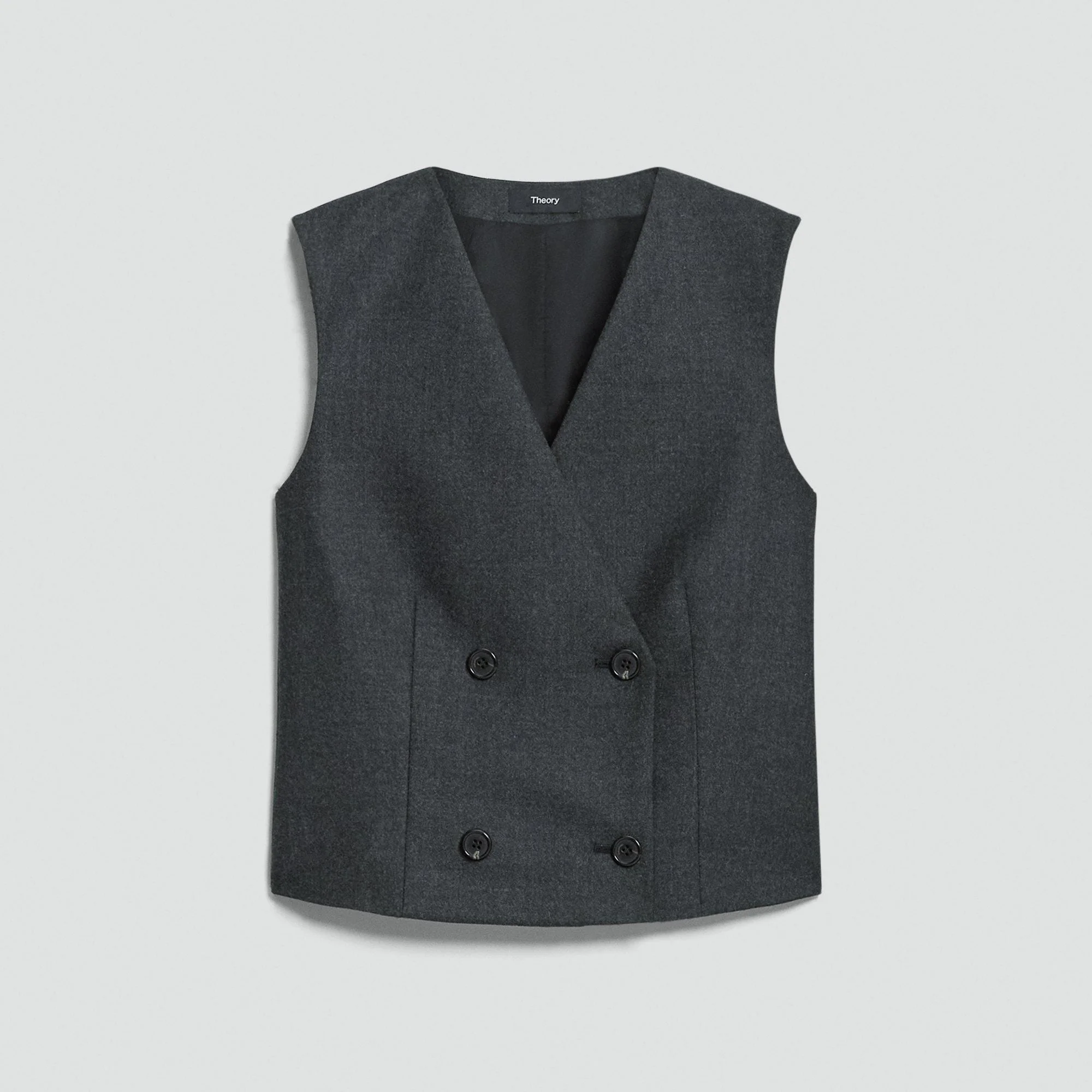 Please enter your email below to be notified when this item is in stock A classic silhouette with the backbone of a blazer. Cut along a surplice neckline, this double-breasted vest fits close to the body. Fully lined, it’s crafted from fine Italian wool flannel that’s soft, lightweight and has a polished look. Sharp on its own or styled beneath a jacket, it’s a nod to transitional dressing. This wool is traceable to the certified responsibly managed Malahide farm in Tasmania, Australia, and is consciously woven by the Botto Giuseppe mill in Biella, Italy. Style #: P0801106 Please enter your email below to be notified when this item is in stock Fit True to size, choose your normal size Slim fit, sleeveless Cropped length Model is 5’11” and wearing a US size 2 Materials & Care Composition 100% virgin wool Care Do not wash. Do not bleach. Do not tumble dry. Warm iron if needed. Dry clean with any solvent except trichloroethylene. Imported