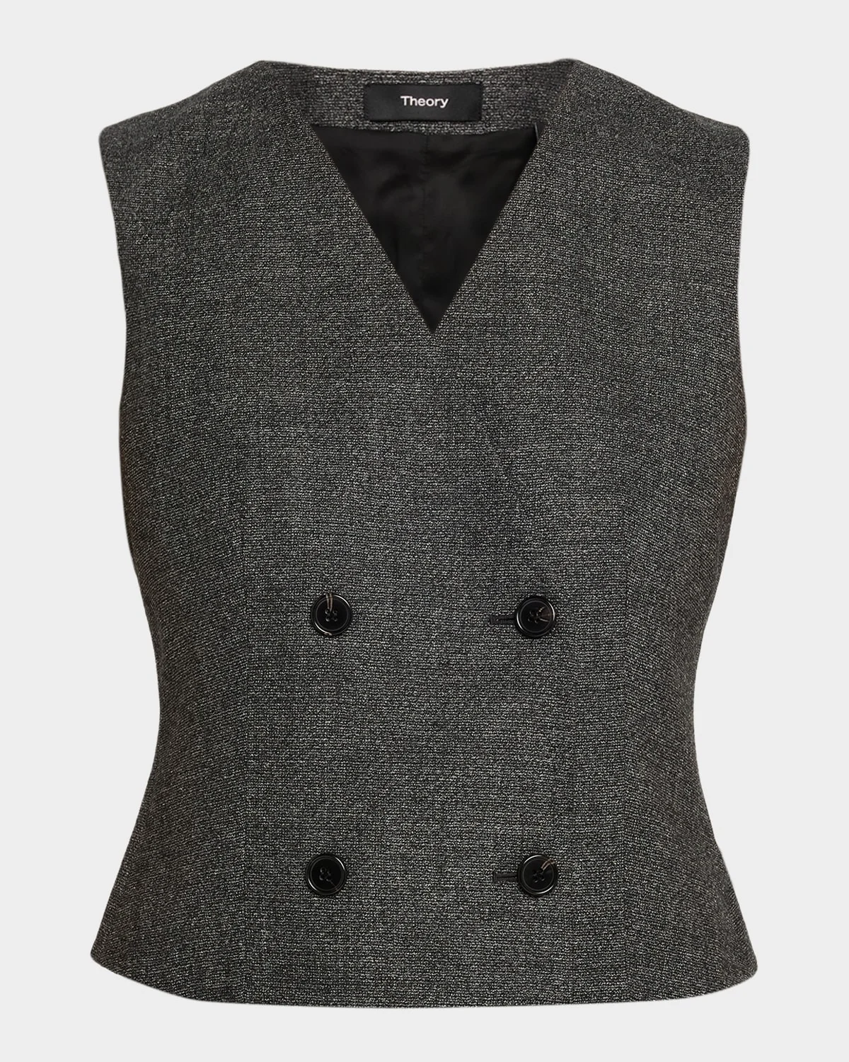- Solid wool suiting vest with a double-breasted front by Theory. - V neckline - Sleeveless - Shrunken fit - Hem sits at the hip - Button-front - Wool - Dry clean - Imported
