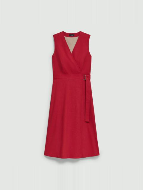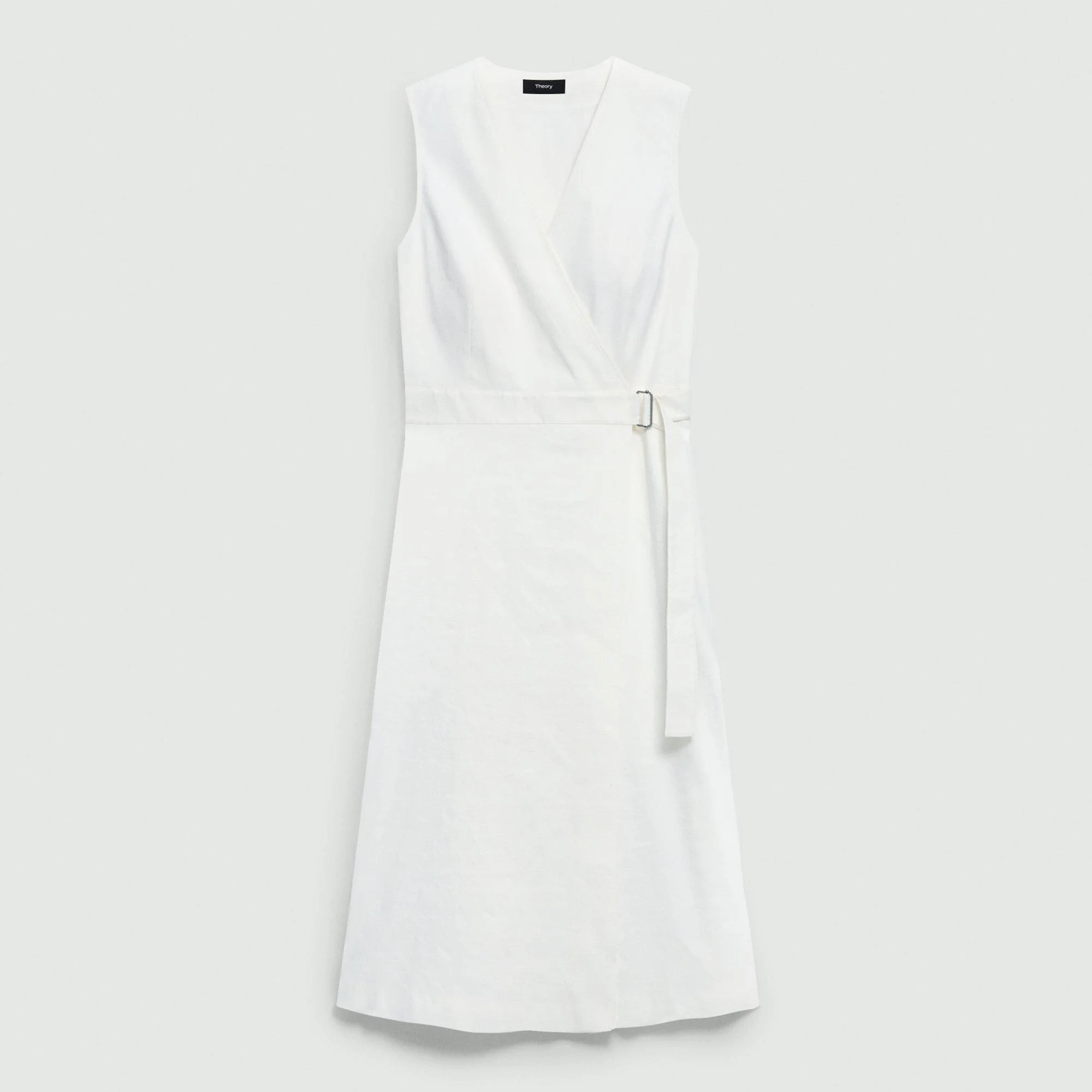 Please enter your email below to be notified when this item is in stock Wrapped at the waist to accentuate its relaxed, A-line silhouette, our wrap dress features a V-neckline and curved hem. Crafted from our signature stretch Good Linen fabric, this sleeveless style is a warm-weather everyday favorite. Theory for Good Woven by the Marini & Cecconi Mill in Prato, Italy, Good Linen is our signature stretch linen fabric, made up of three fibers—flax sourced from France, viscose made from repurposed waste cotton fibers, and recycled elastane for stretch. Learn more about our Good Linen. Style #: P0303605 Please enter your email below to be notified when this item is in stock Fit True to size, choose your normal size A-line silhouette, sleeveless Below-the-knee length Model is 5’11” and wearing a US size 2 Materials & Care Composition 65% linen 31% viscose 4% elastane Care Do not wash. Do not bleach. Do not tumble dry. Cool iron if needed. Dry clean with any solvent except trichloroethylene. Imported