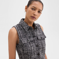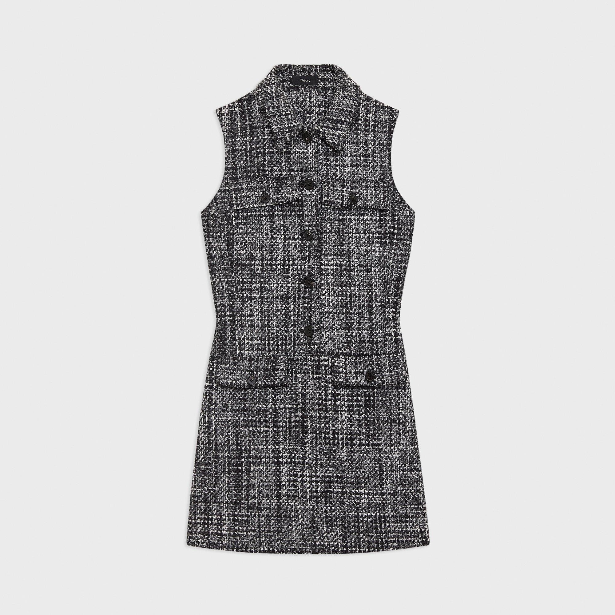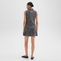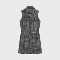 Our military dress is tailored in a luxurious tweed sourced from the archives of a family owned mill in Prato, Italy using certified recycled wool and recycled polyester. Its fit-and-flare silhouette features a partial button front closure to meet a pointed collar, a pair of front flap pockets, hip slip pockets and zipped up the side. Style #: O0901603 Fit True to size, choose your normal size Fit-and-flare silhouette, sleeveless Above-the-knee length Model is 5’11” and wearing a US size 2 Materials & Care Composition 45% wool 30% polyester 17% acrylic 8% polyamide Care Do not wash. Do not bleach. Do not tumble dry. Cool iron if needed. Dry clean with any solvent except trichloroethylene. Imported
