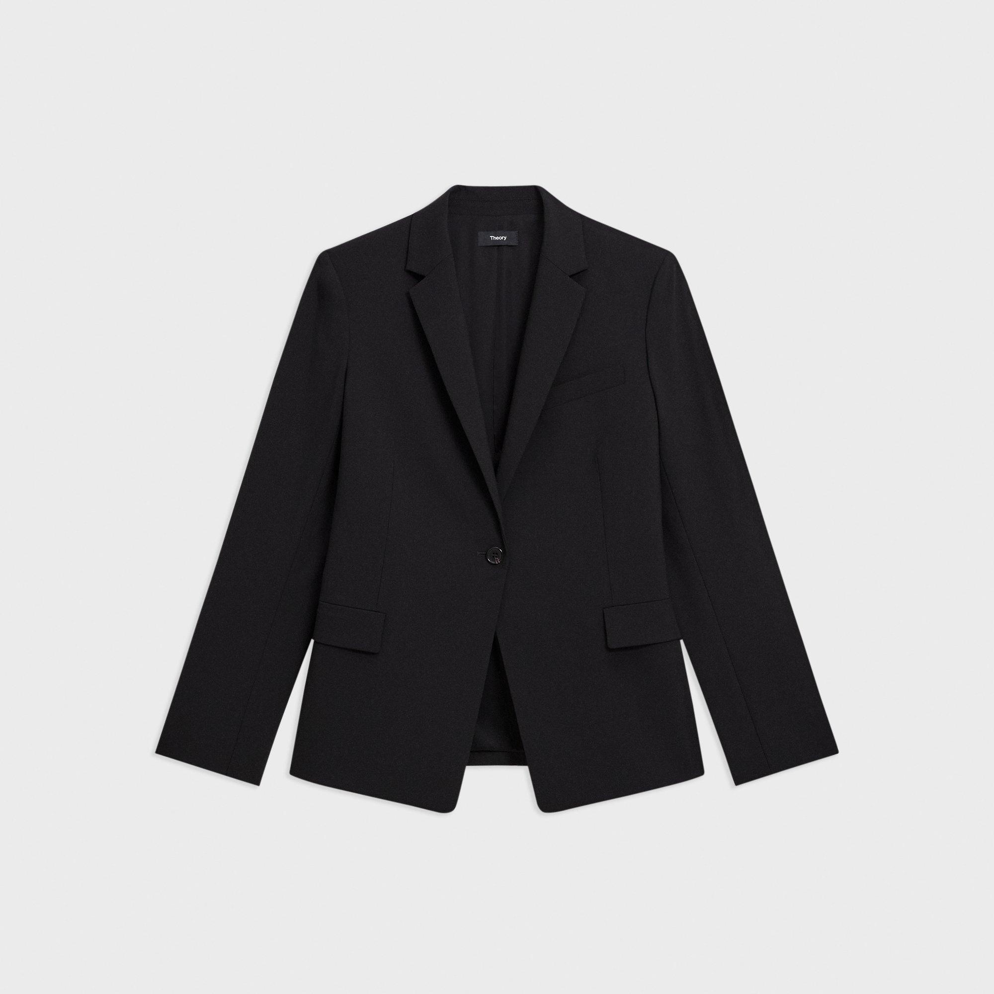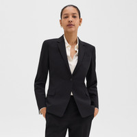 Tailored with a slim silhouette and a nipped-in waist, this slightly cropped blazer is detailed with notch lapels, a single-button closure, and flap pockets. It's crafted with Good Wool with a hint of stretch for a relaxed feel. Theory for Good We are committed to making a positive impact on the people who wear our clothes, our industry, and our planet, beginning with our Good fabrics. Consciously manufactured from start to finish, our Good Wool is crafted with premium merino wool. It’s sourced from certified responsibly managed farms in Australia, including the Beaufront farm in Tasmania and woven by the Tollegno 1900 mill in Biella, Italy. Learn more about our Good Wool. Style #: O0801117 Fit True to size, choose your normal size Slim fit, long sleeves Hip length Model is 5’11” and wearing a US size 2 Materials & Care Composition 96% wool 4% elastane