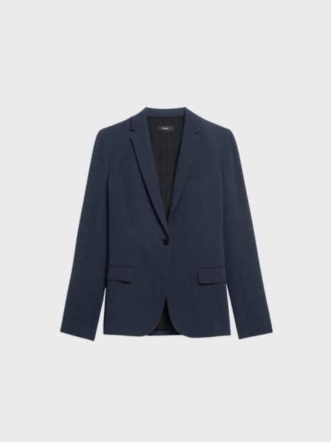 Please enter your email below to be notified when this item is in stock Our Staple blazer is a slim-fitting silhouette that’s sharply constructed with a single-button front closure and notch lapels. It's detailed with an angled chest pocket, cutaway front, and waist flap pockets. Crafted with our signature Japanese Admiral Crepe for a smooth and softly draped fit that maintains a polished appearance. We are committed to positively impacting the people who wear our clothes, our industry, and our planet, beginning with our fabrics. Our signature Admiral Crepe is woven with triacetate, a fabric made from acetic acid and wood pulp sourced from sustainably managed forests. Style #: J0709113 Please enter your email below to be notified when this item is in stock Fit True to size, choose your normal size Slim fit, long sleeves Regular length Model is 5’11” and wearing a US size 2 Materials & Care Composition 70% triacetate 30% polyester Care Do not wash. Do not bleach. Do not tumble dry. Cool iron if needed. Dry clean with any solvent except trichloroethylene. Imported