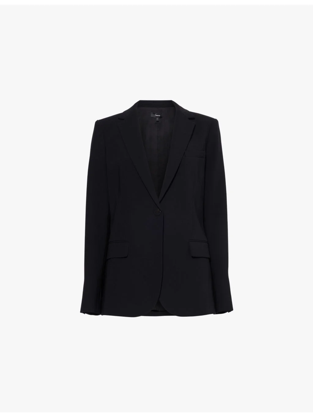 PRODUCT DETAILS - Theory woven blazer - 70% triacetate, 30% polyester; lining 100% polyester - Button fastening - Regular fit, single breasted, notched lapels, soft padded shoulders, long sleeves, buttoned sleeve hems, welt pocket at chest, two flap pockets at front, open vent at back, crepe texture, lined - Dry clean only - True to size - Size UK 8: length 26in / 66cm - Model is 5ft 10in/1.78m and wears a size UK 8 - Midweight, slight stretch