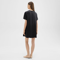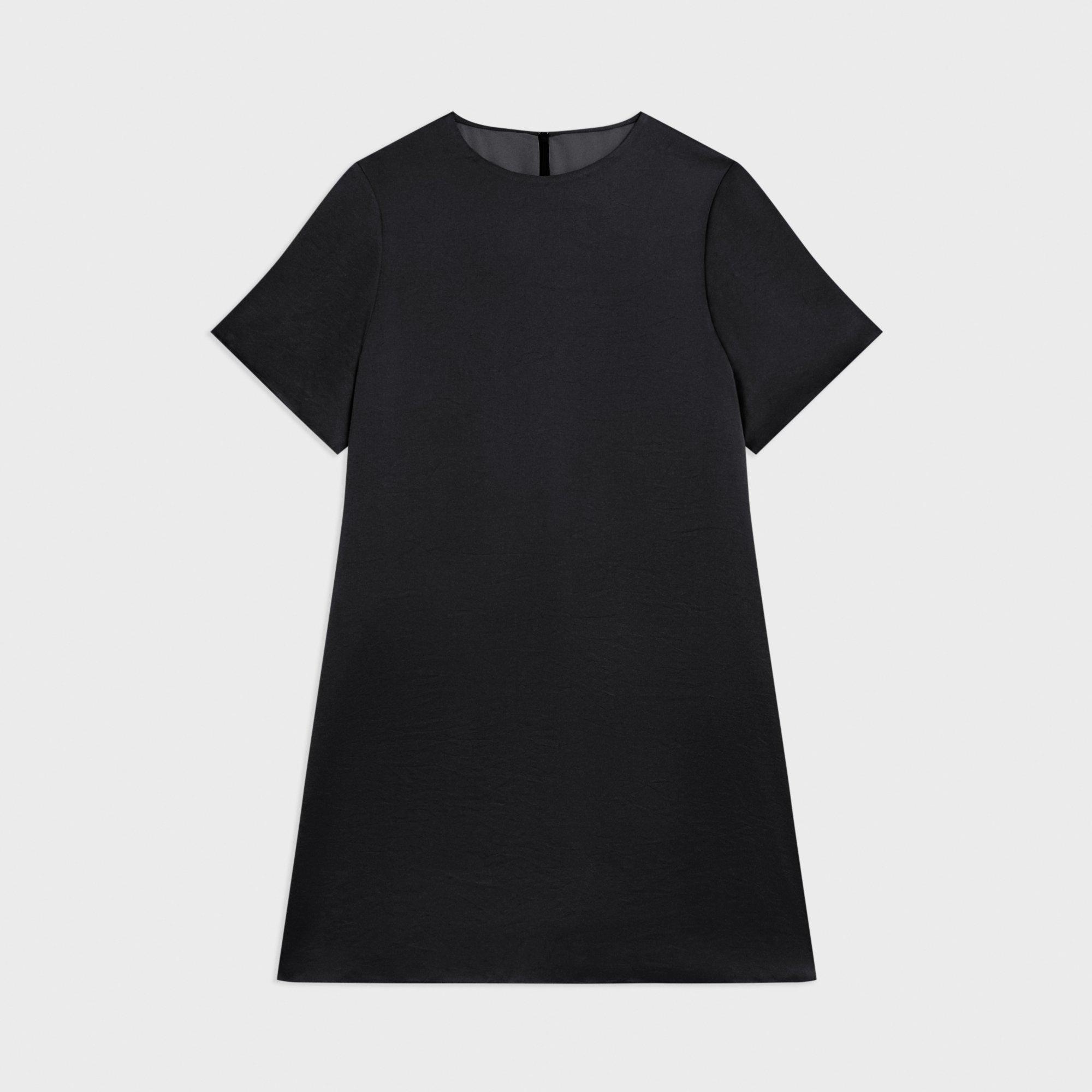 An elevated take on the t-shirt dress, this oversized silhouette is tailored in lightweight satin with a subtle crinkled finish from Japan. With short sleeves and crew neckline, it’s machine washable for easy wear and care. Style #: O0605608 Fit True to size, choose your normal size Oversized silhouette, short sleeves Above-the-knee length Model is 5’11” and wearing a US size S Materials & Care Composition 100% polyester Care Machine wash cold, gentle cycle. Do not bleach. Hang to dry in shade, do not tumble dry. Cool iron if needed. Dry clean with any solvent except trichloroethylene. Imported