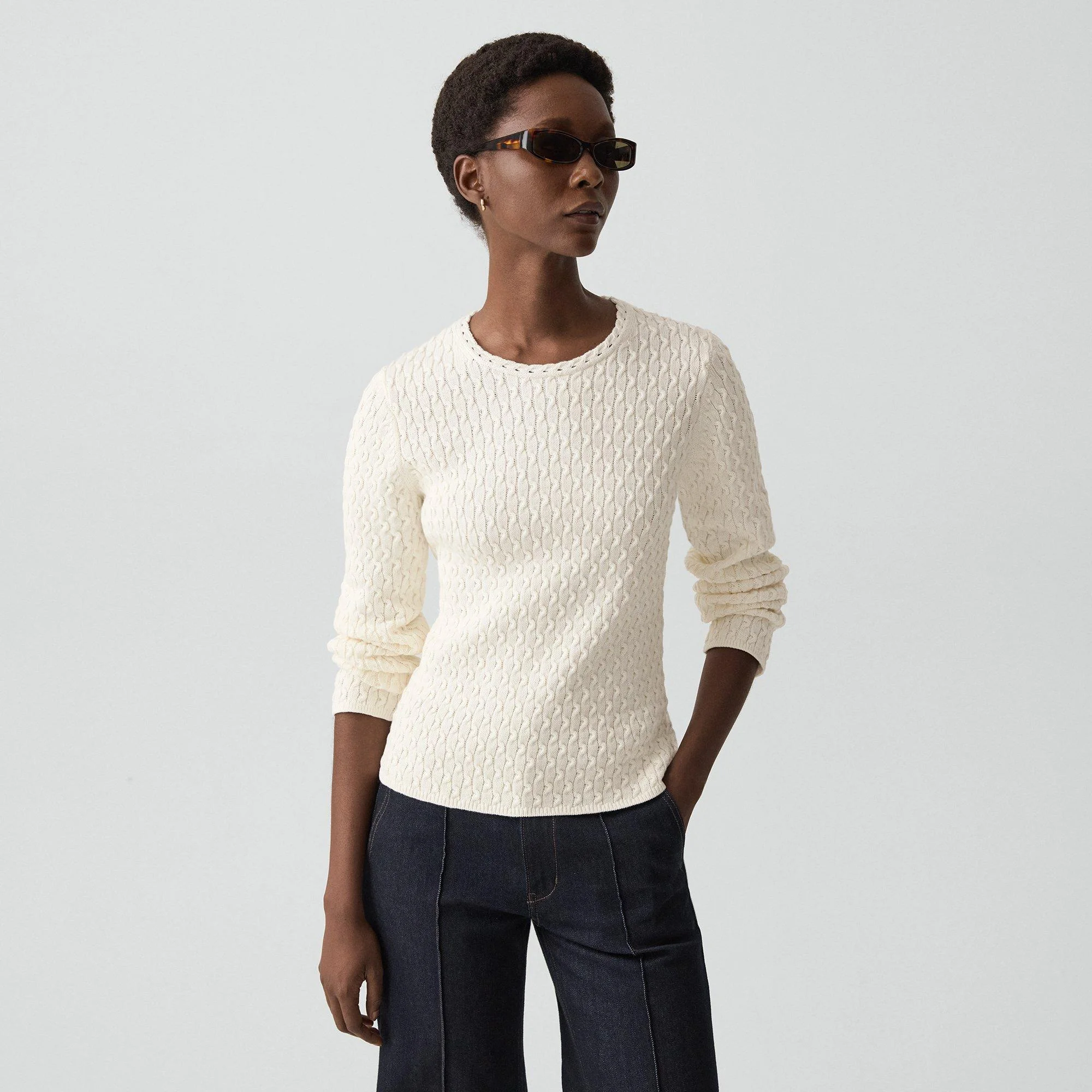 Please enter your email below to be notified when this item is in stock This crewneck sweater features ribbed cuffs and slightly dropped shoulders. Designed for a slim fit, it’s knit in a warm-handed, certified organic cotton yarn with textured stitches and soft dimension. It's fine thread count gives it a versatile weight to wear in any season. Style #: Q0214719 Please enter your email below to be notified when this item is in stock Materials & Care Composition 100% cotton; exclusive of elastic Care Hand wash cold. Do not bleach. Lay flat to dry in shade, do not tumble dry. Cool iron if needed. Dry clean with any solvent except trichloroethylene. Imported