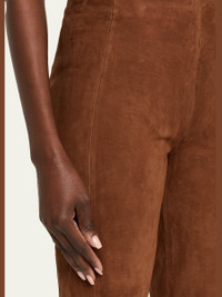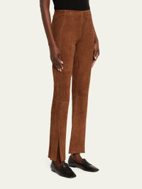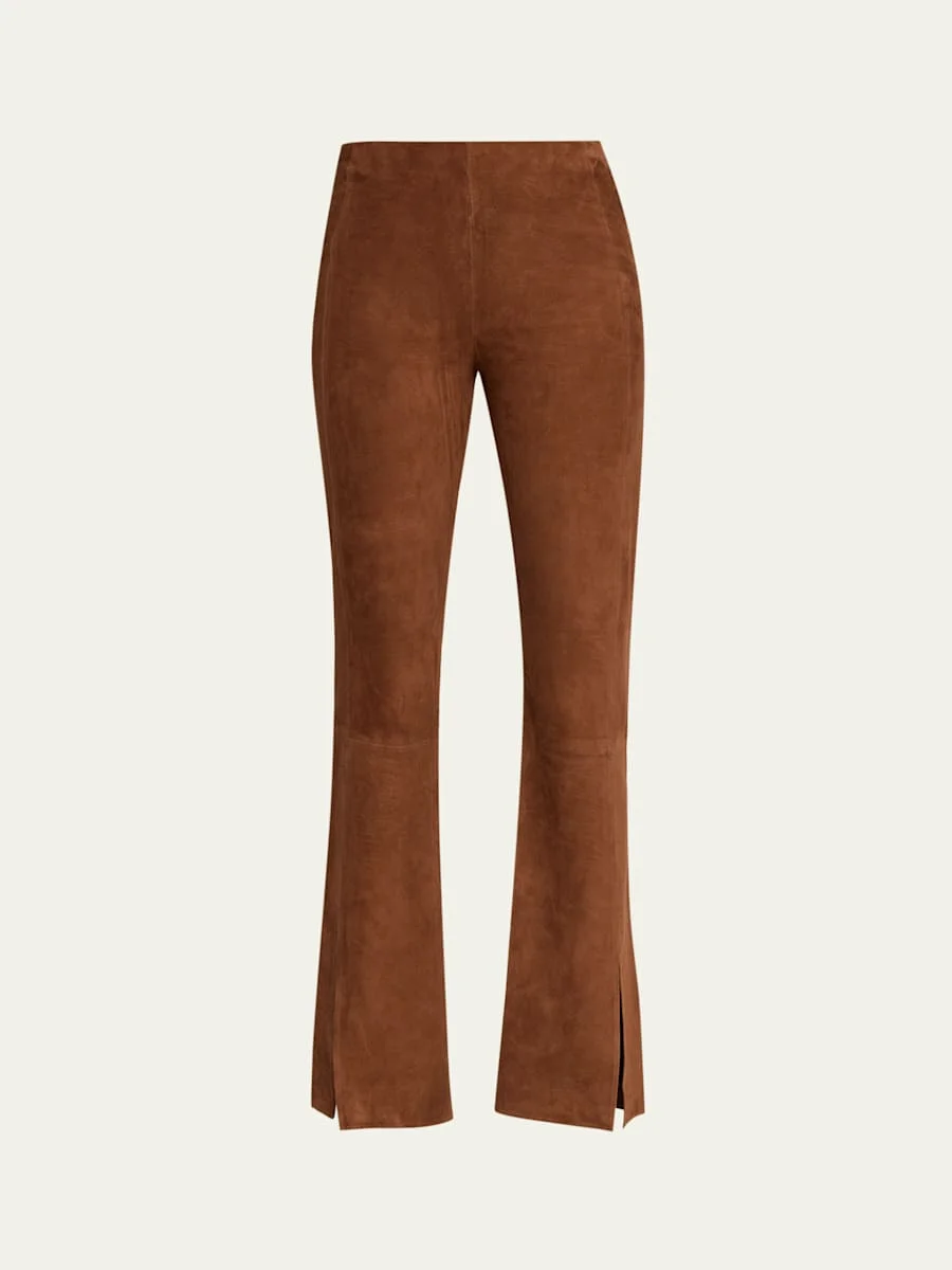 Supple suede pants adorned with a split hem by Theory. High rise Flat front Slim, flared legs Full length Zip closure Leather Professional cleaning recommended Imported