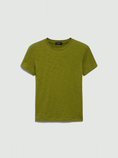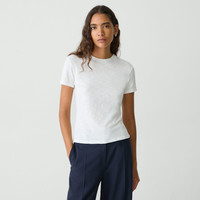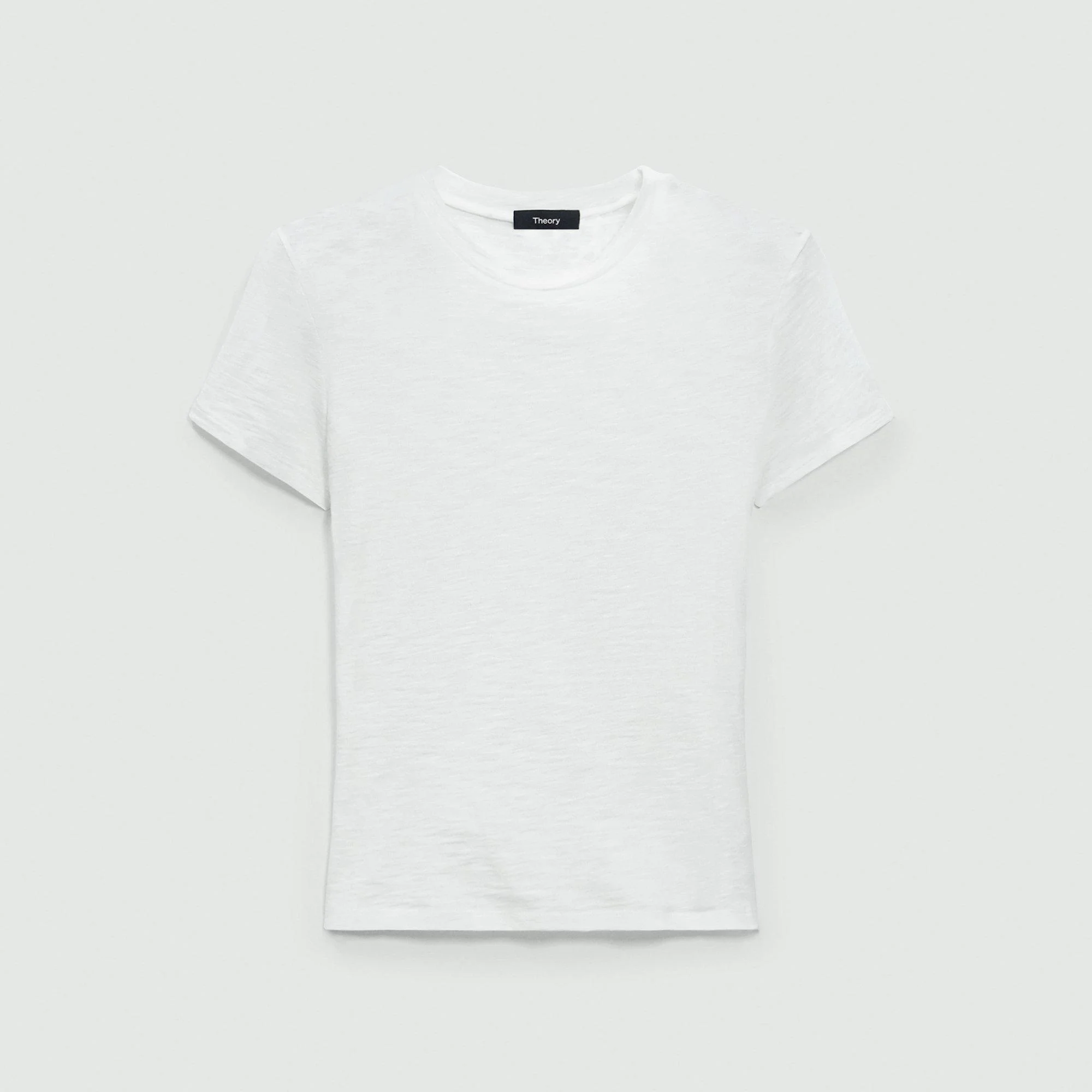 This short-sleeve tee is an everyday style with a bound crew neckline and double-needle topstitching along the sleeves and hem. Close-fitting enough to wear under a blazer, this shirt is cut in an easy fit from soft, organic cotton that has a heathered finish and subtle texture. Style #: J0224509 Fit Runs small, choose one size larger than normal Fitted with intention, short sleeves Hip length Model is 5’11” and wearing a US size S Materials & Care Composition 100% cotton Care Machine wash cold. Tumble dry low. Cool iron if needed. Do not bleach or dry clean.