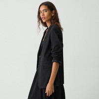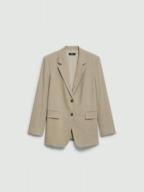 Please enter your email below to be notified when this item is in stock Cut for a more relaxed fit, this notch-lapel blazer features classic detailing in a welt pocket, side flap pockets, and a two-button closure. Crafted from our signature stretch Good Linen fabric, this single-breasted style is a warm-weather everyday favorite. Theory for Good Woven by the Marini & Cecconi Mill in Prato, Italy, Good Linen is our signature stretch linen fabric, made up of three fibers— flax sourced from France, viscose made from repurposed cotton fiber waste, and certified recycled elastane for stretch. Learn more about our Good Linen. Style #: P0303106 Please enter your email below to be notified when this item is in stock Fit True to size, choose your normal size Oversized fit, long sleeves Hip length Model is 5’11” and wearing a US size 2 Materials & Care Composition 62% linen 36% viscose 2% elastane Care Do not wash. Do not bleach. Do not tumble dry. Cool iron if needed. Dry clean with any solvent except trichloroethylene. Imported