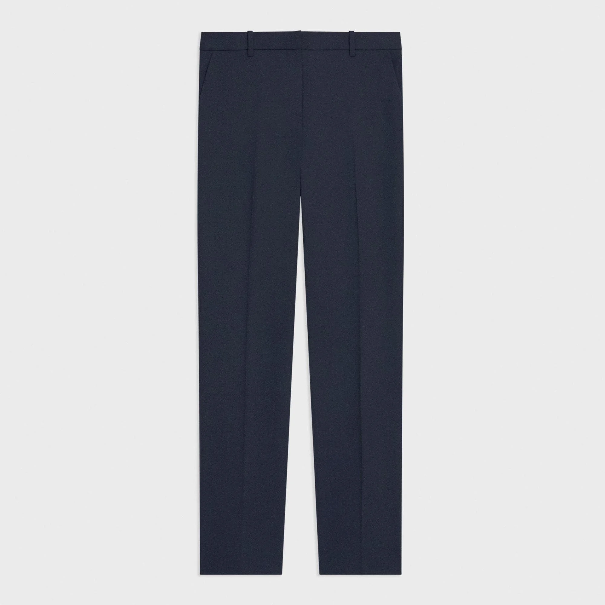 A distinguished Theory favorite, this full-length pant is tailored in our best-selling Treeca fit, which flatters the leg with a slim-cut profile. It’s detailed with a hook-and-zip closure, side slip pockets, and a back welt pocket. Wear it with or without the matching Carissa blazer. Theory for Good We are committed to making a positive impact on the people who wear our clothes, our industry, and our planet, beginning with our Good fabrics. Consciously manufactured from start to finish, our Good Wool is crafted with premium merino wool. It’s sourced from farms in Australia, including the Beaufront farm in Tasmania and woven by the Tollegno 1900 mill in Biella, Italy. Learn more about our Good Wool. Style #: J0701214 Fit Runs large, we recommend sizing down for a more tailored look Mid rise, slim leg Full length Model is 5’11” and wearing a US size 2 Materials & Care Composition 96% wool 4% elastane Care Do not wash. Do not bleach. Do not tumble dry. Cool iron if needed. Dry clean with any solvent except trichloroethylene. Imported