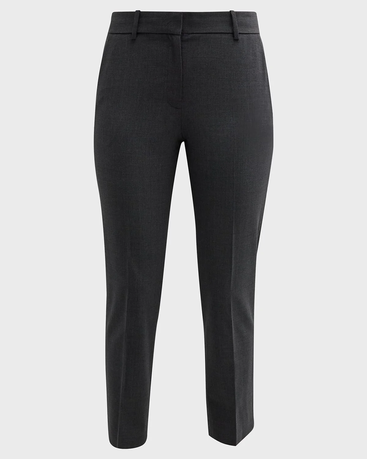- Theory "Treeca" pants in Good Wool suiting. - Approx. measurements: - 25 1/2" inseam; 13 1/2" leg opening; 10 1/2" front rise; 15" back rise, size 8. - High rise; flat front. - Side slash pockets. - Rear welt pockets. - Fitted through skinny legs. - Cropped above ankles. - Hook/zip fly; belt loops. - Wool/spandex. - Dry clean. - Imported. - Fashioned for change: sustainable materials. Find out more - here