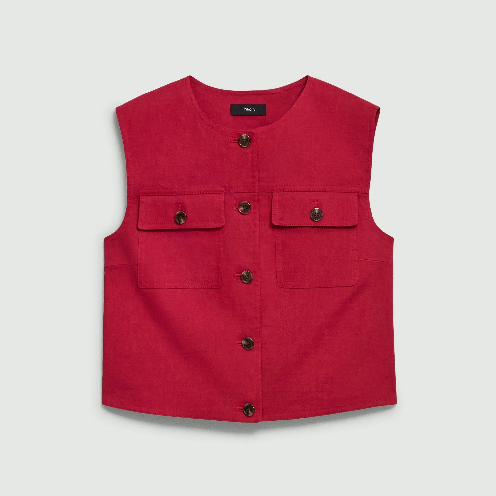 Please enter your email below to be notified when this item is in stock Worn as a top on its own or an outside layer, this vest is tailored for a relaxed silhouette with a crew neckline and flap pockets. The single-breasted, button-front design is crafted from our signature stretch Good Linen fabric. Theory for Good We are committed to making a positive impact on the people who wear our clothes, our industry, and our planet, beginning with our Good Collection fabrics. Woven by the Marini & Cecconi Mill in Prato, Italy, Good Linen is our signature stretch linen fabric, made up of three fibers—flax sourced from France, viscose made from repurposed waste cotton fibers, and recycled elastane for stretch. Learn more about our Good Linen. Style #: P0303110 Please enter your email below to be notified when this item is in stock Fit True to size, choose your normal size Relaxed fit, sleeveless Hip length Model is 5’11” and wearing a US size 2 Materials & Care Composition 62% linen 36% viscose 2% elastane Care Do not wash. Do not bleach. Do not tumble dry. Cool iron if needed. Dry clean with any solvent except trichloroethylene. Imported