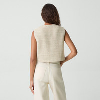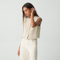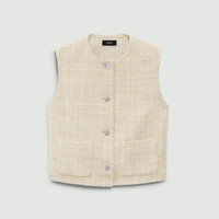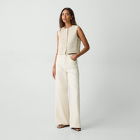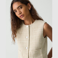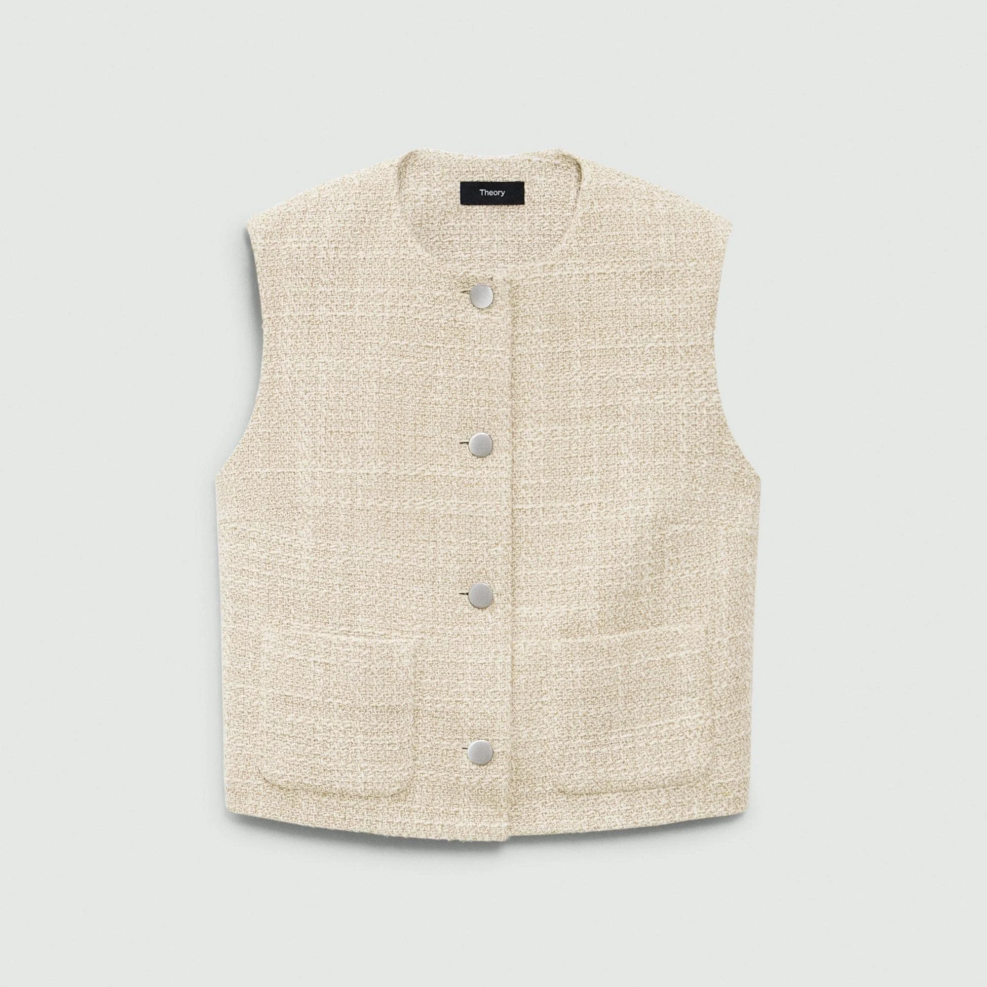 This classic crewneck vest features side patch pockets and button-front closures. Cut for a relaxed fit, this single-breasted style is perfect on its own or layered over everyday essentials. Produced by an Italian fabric mill using a bi-color twisted yarn, this versatile and transitional-weight tweed is woven using certified recycled cotton from pre-consumer waste and a portion of certified recycled polyester made from pre-consumer waste. Style #: P0204103 Fit True to size, choose your normal size Relaxed fit, sleeveless Waist length Model is 5’11” and wearing a US size 2 Materials & Care Composition 73% cotton 24% polyester 3% other fibers Care Do not wash. Do not bleach. Do not tumble dry. Cool iron if needed. Dry clean with any solvent except trichloroethylene. Imported