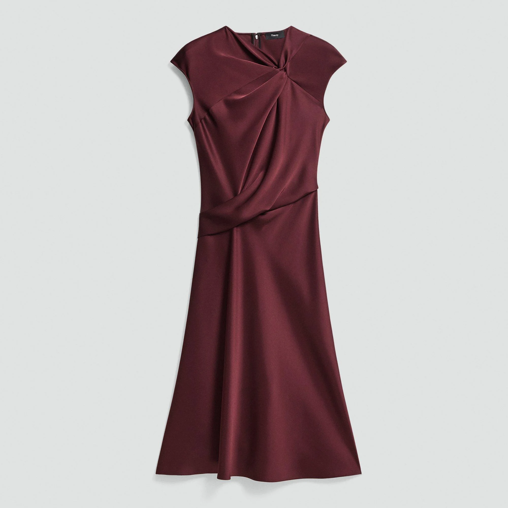 Please enter your email below to be notified when this item is in stock An asymmetrical neckline and twisted bodice define this midi dress. Secured with a back zip closure, it features cap sleeves and a flared hem. It’s crafted in a drapey Japanese double satin that’s woven with triacetate, a fabric made from acetic acid and wood pulp sourced from certified responsibly managed forests. Style #: P1009607 Please enter your email below to be notified when this item is in stock Fit True to size, choose your normal size Fit-and-flare silhouette, cap sleeves Midi length Model is 5’11” and wearing a US size 2 Materials & Care Composition 87% triacetate 13% polyester Care Do not wash. Do not bleach. Do not tumble dry. Cool iron with press cloth if needed. Dry clean with any solvent except trichloroethylene. Imported