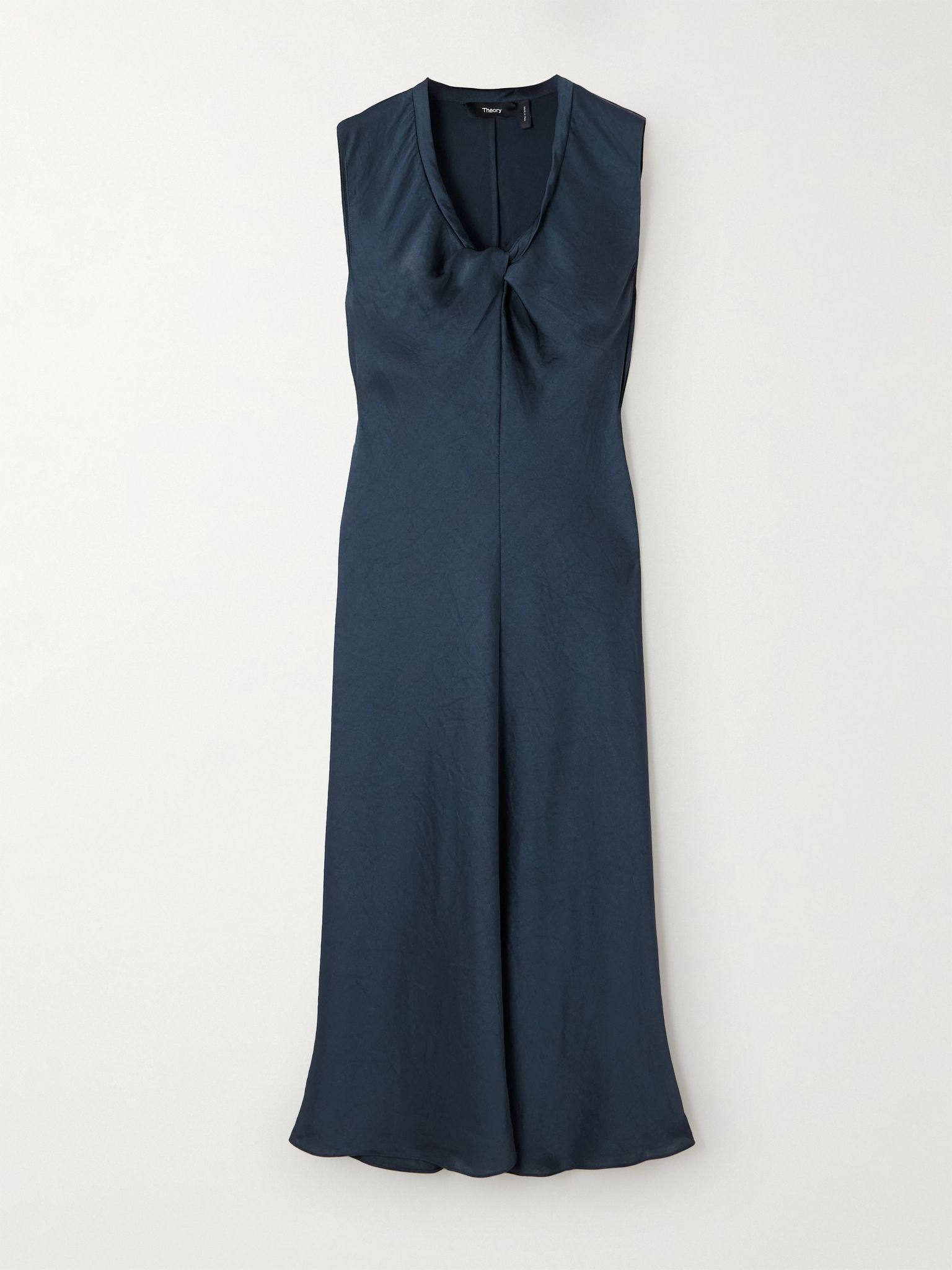 Theory's aptly named 'Twist Scoop' dress is delicately gathered along the neckline, creating subtle ripples through the bodice. It's made from lustrous recycled-satin in a figure-skimming fit and works just as well for the office or dinner plans. Size & Fit - Fits true to size, take your normal size - Designed for a slim fit - Lightweight, non-stretchy fabric - Model is 175cm/ 5'9" and is wearing a US 2 Model measurements: - Bust: 78cm/ 31" - Waist: 62cm/ 24.5" - Hip: 92cm/ 36" Details & Care - Navy recycled-satin - Slips on - 100% recycled polyester - Unlined - Dry clean