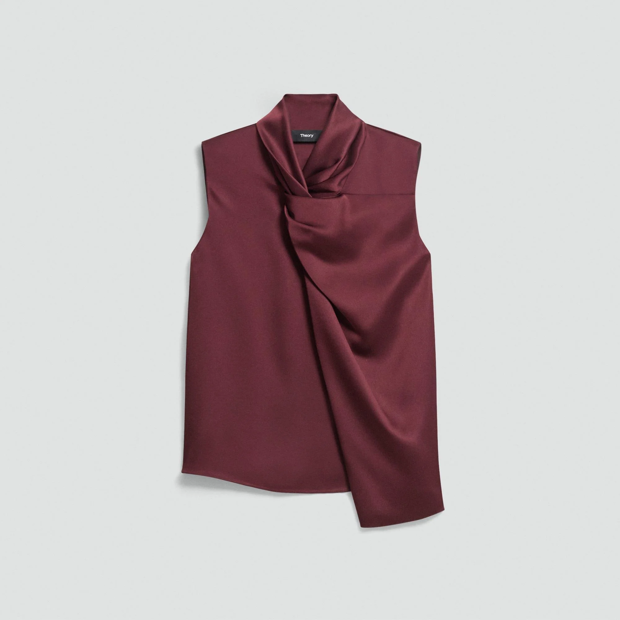 Please enter your email below to be notified when this item is in stock Designed with a draped twist neckline and an asymmetric split front, this sleeveless blouse skims the body with a fluid, relaxed fit. Its sculptural drape lends itself to both understated tailoring and evening separates, making it an easy statement piece. It’s crafted in a drapey Japanese double satin that’s woven with triacetate, a fabric made from acetic acid and wood pulp sourced from certified responsibly managed forests. Style #: P1009506 Please enter your email below to be notified when this item is in stock Fit True to size, choose your normal size Relaxed fit, sleeveless Short length Model is 5’11” and wearing a US size S Materials & Care Composition 87% triacetate 13% polyester Care Do not wash. Do not bleach. Do not tumble dry. Cool iron with press cloth if needed. Dry clean with any solvent except trichloroethylene. Imported