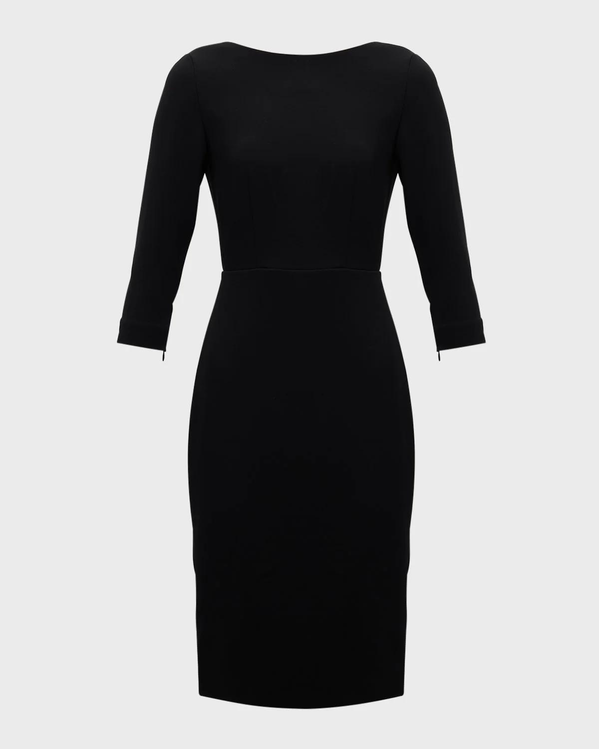 - EXCLUSIVELY AT NEIMAN MARCUS - Theory "Varetta Admiral" crepe dress. - Approx. length: - 38"L down center front, 34"L down center back. - Bateau neckline; scoop back. - Three-quarter sleeves with hidden zips. - Sheath silhouette. - Straight hem. - Hidden back zip. - Triacetate/polyester. - Polyester/spandex lining. - Dry clean. - Made in USA of Italian materials. - Size Note: Height: 5'11"/ waist 24”/ hips 35"/ bust 30" - Model is wearing size 2