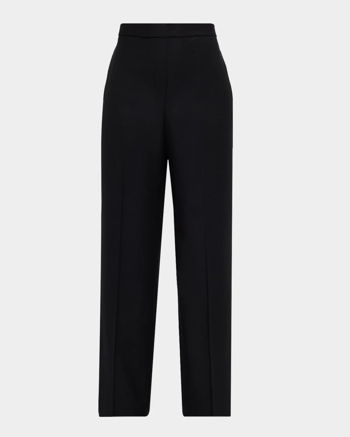 These pants from Theory are crafted of virgin wool and designed with an elastic waistband for a comfortable yet sleek silhouette. Midrise; sits high on the hip Side pockets Wide legs Full length Pullon style Virgin wool Dry clean Imported