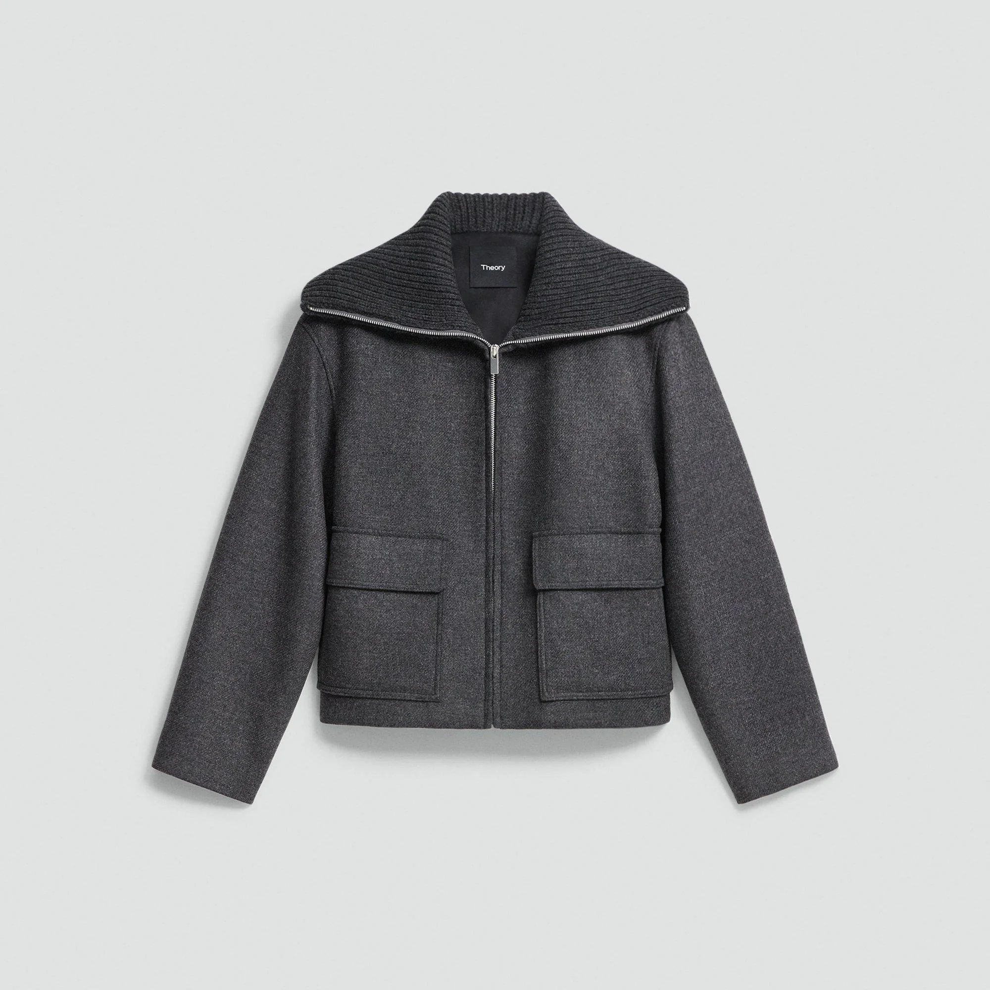 Please enter your email below to be notified when this item is in stock Defined by a wide wing collar and zip front, this jacket balances sharp tailoring with a relaxed ease. Finished with patch pockets and a straight hem, it can be styled open over sleek separates or zipped up for a more sculptural look. Crafted from certified recycled wool and certified recycled polyamide made from consumer waste. It offers both warmth and refinement. Style #: P0901402 Please enter your email below to be notified when this item is in stock Fit True to size, choose your normal size Relaxed fit, long sleeves Short length Model is 5’11” and wearing a US size S Materials & Care Composition shell: 70% wool 29% polyamide 1% acrylic; collar: 100% wool Care Do not wash. Do not bleach. Do not tumble dry. Cool iron if needed. Dry clean with any solvent except trichloroethylene. Imported