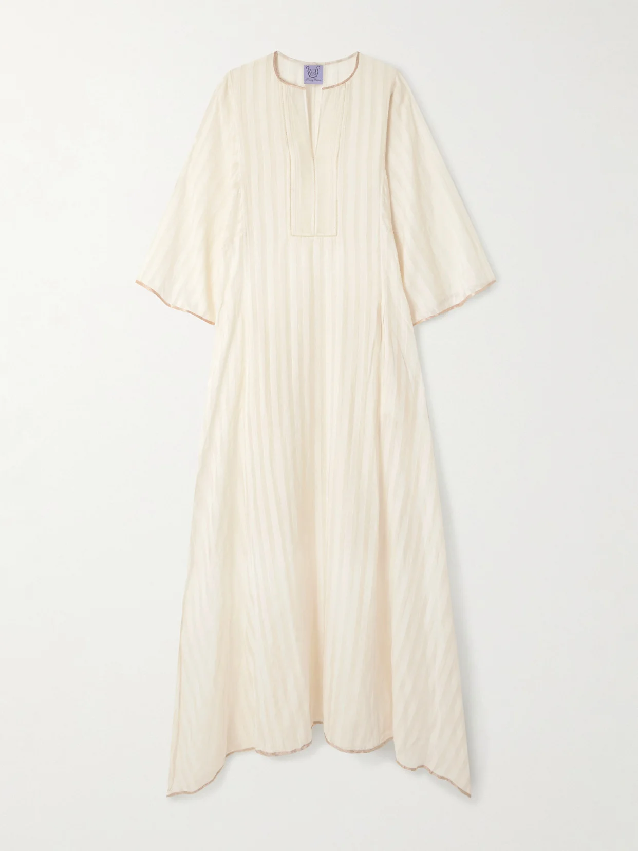 Modeled on breezy kaftans, Thierry Colson's 'Rachel' dress is perfect for vacations. It's made from lightweight cotton and silk-blend and patterned with tonal stripes. Glossy satin trims frame the crew neck, fluttery sleeves and asymmetric hem.