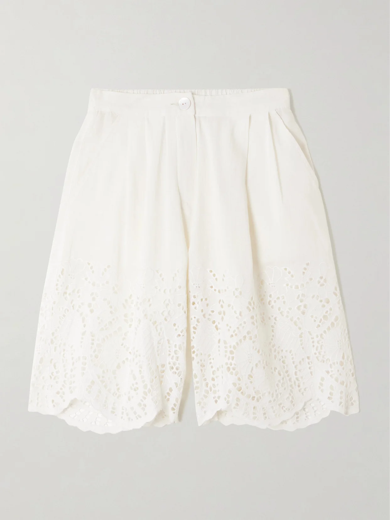 Scalloped Pleated Broderie Anglaise Linen And Cotton-blend Shorts