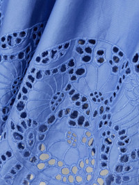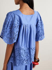Thierry Colson's 'Scarletta' blouse is made from cotton-poplin with pretty broderie anglaise on the sleeves and scalloped hem. It's cut for a loose, boxy shape and traced with pintucked pleats just below the square neckline. Wear yours with tonal pants and sandals. Size & Fit - Fits true to size, take your normal size - Designed for a loose fit - Lightweight, non-stretchy fabric - Model is 175cm/ 5'9" and is wearing a size XSmall Model measurements: - Bust: 81cm/ 32" - Waist: 62cm/ 24.5" - Hip: 89cm/ 35" Details & Care - Blue broderie anglaise cotton-poplin - Slips on - 100% cotton - Unlined - Hand or machine wash