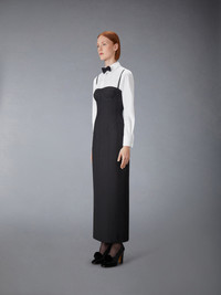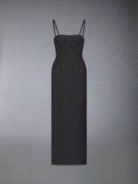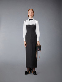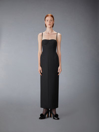 Pencil dress in black 2-ply wool fresco with tonal grosgrain-trimmed corset boning. Thin grosgrain shoulder straps Back zip closure with silver tone metal pull Single back vent Signature striped grosgrain loop tab at back Model is 5'10" (178 cm), wearing size 40 100% Wool Made in Italy FDSD82B-00473-001