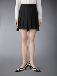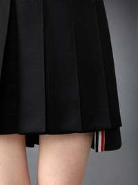 This pleated mini skirt is tailored in structured wool mohair with a dropped back hem and internal stripe lining. A signature silhouette in scale and proportion, it captures the tension between classic construction and bold, abbreviated form. Side zip closure with RWB-detailed pull Adjustable buttoned waistband strap Side vents with RWB grosgrain trim Stepped hem Tricolor lining Signature striped grosgrain loop tab Model is 5'10" (178 cm), wearing size 40 60% Wool, 40% Mohair Combo 1: 100% Silk Lining: 100% Cupro Made in Italy FGC724A-00170-001