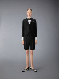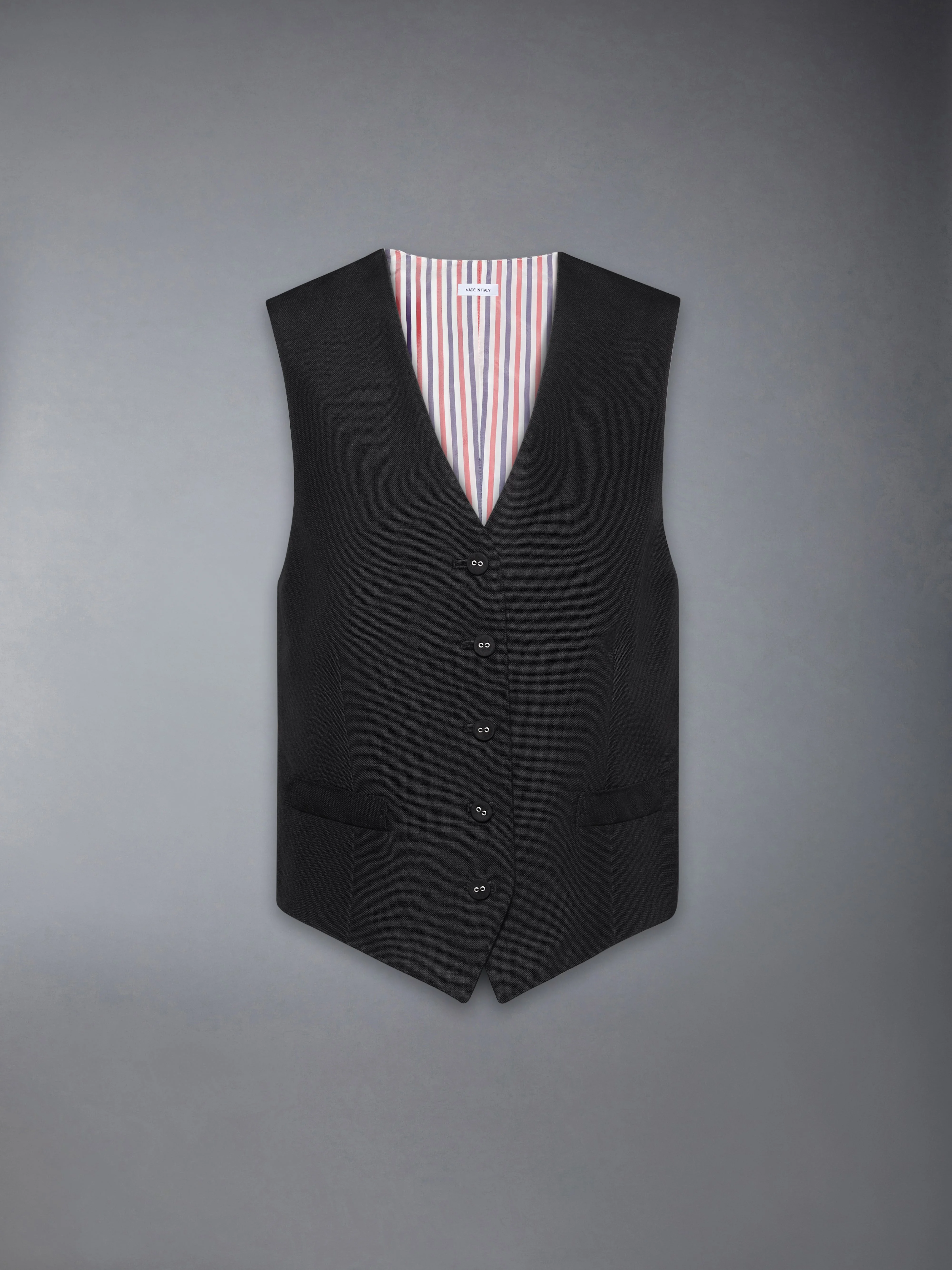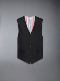 Tailored in structured 3-ply wool mohair, this vest refines a uniform staple with clean lines and minimal detailing. Self-covered buttons and slip pockets emphasize its precise construction, while striped cupro at the back introduces a subtle signature within. Front self-covered button closure Welt hand pockets Signature striped grosgrain loop tab Model is 5'10" (178 cm), wearing size 40 60% Wool, 40% Mohair Lining: 100% Cupro Made in Italy FVC004A-00170-001