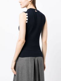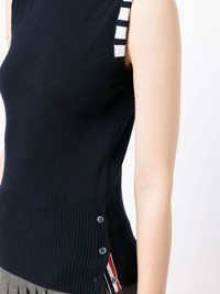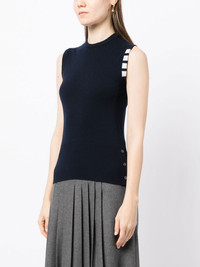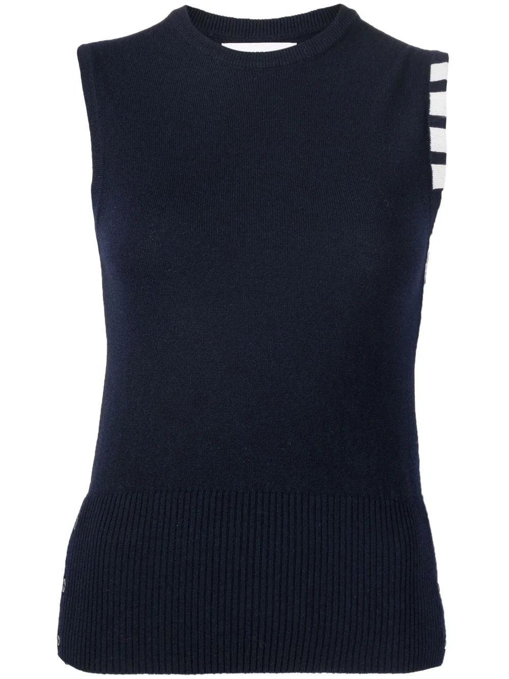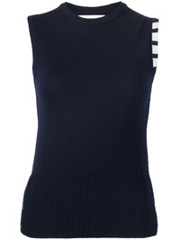 4-Bar cashmere knitted top Highlights - Navy blue - Cashmere - Crew neck - Sleeveless - Ribbed hem - Side button fastening - Signature 4-bar stripe - Signature grosgrain loop tab Made in United Kingdom Composition Cashmere 100% SIZE & FIT Model measurements Height 5 ft 11 in(1.8 m) Bust/Chest 28.34 in(72 cm) Hips 35.43 in(90 cm) Waist 23.62 in(60 cm) Measurement BUST 25.98 in(66 cm) LENGTH 21.25 in(54 cm) Shoulder Width 12.2 in(31 cm)