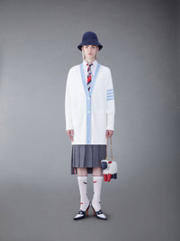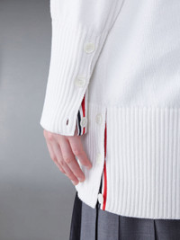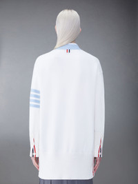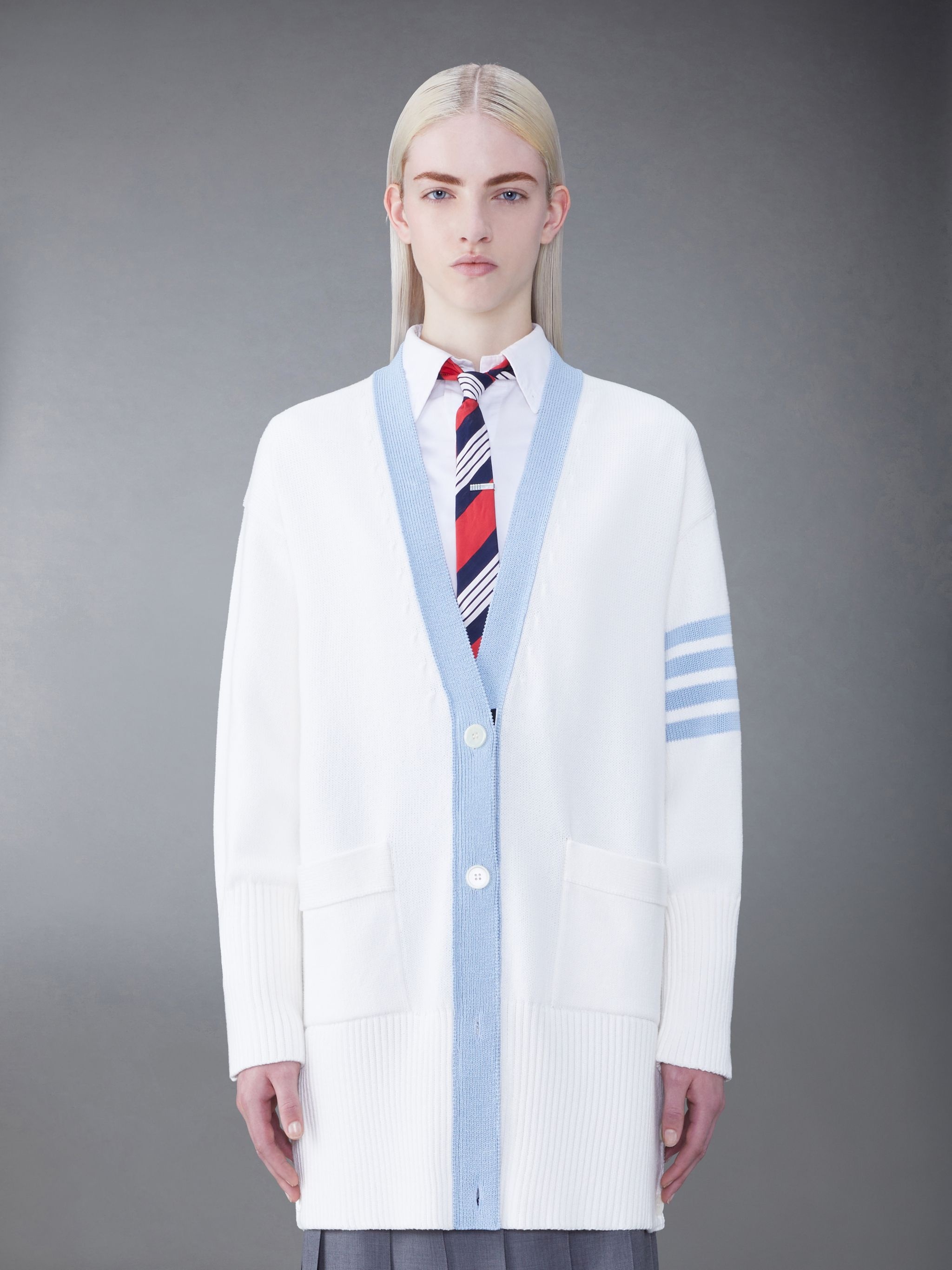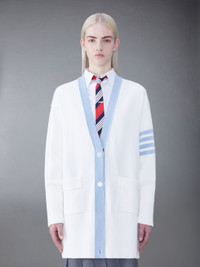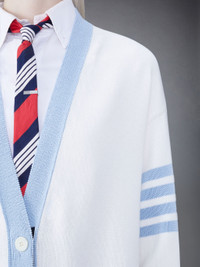 DETAILS & FIT Two Thom Browne emblems define our Cotton 4-Bar Oversized V-Neck Cardigan — red and white grosgrain trim and 4-Bar stripe detailing, both synonymous with the brand. Presented in breathable cotton fabric, this cardigan exudes sophistication. V neck 4-Bar detailing Front patch pockets Front button closure Buttoned cuffs with signature striped grosgrain trim Signature striped grosgrain loop tab Model is 5'10" (178 cm), wearing size 40 100% Cotton FKC563A-Y3017-100