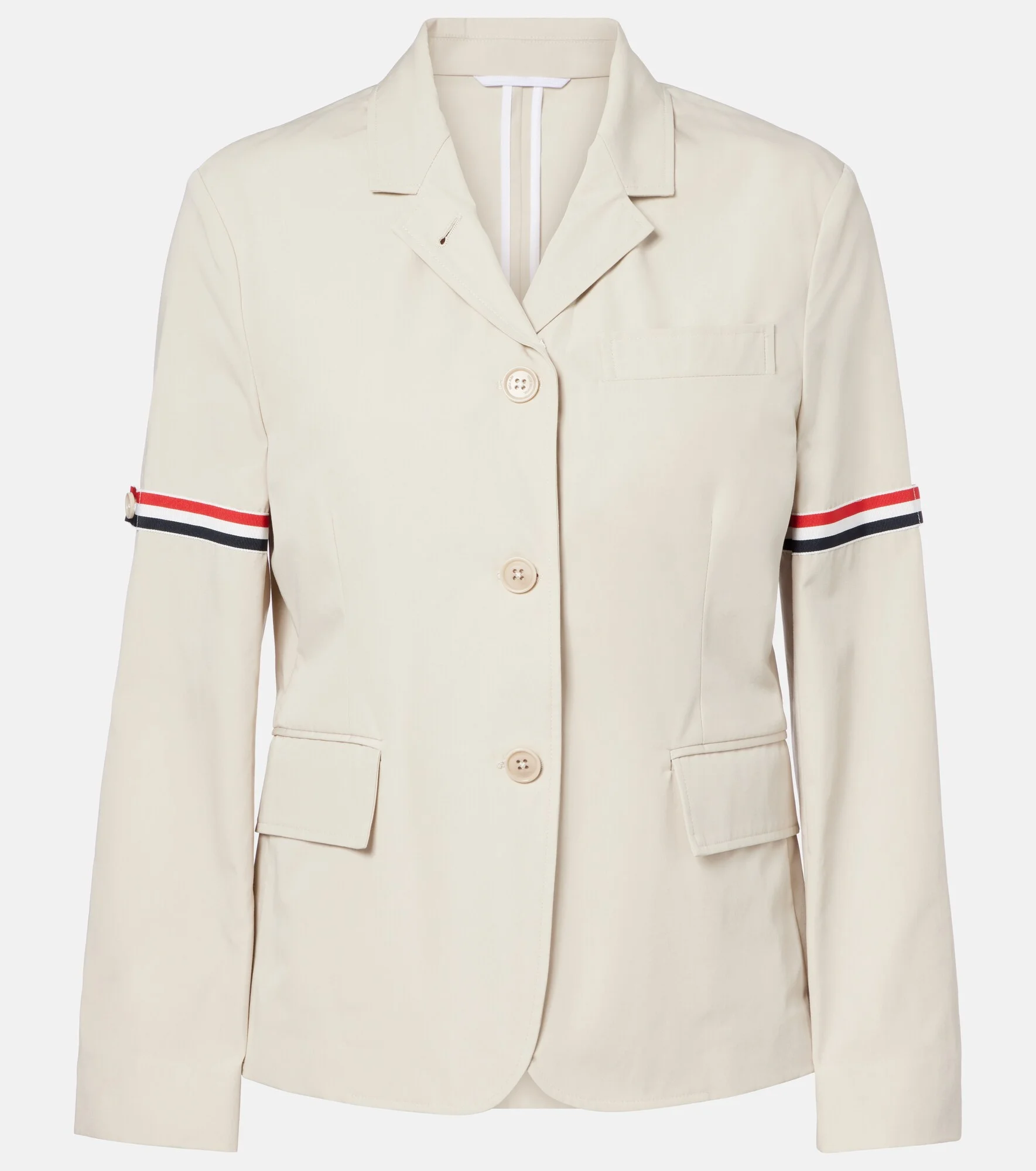 Contrasting 4-Bar horizontal stripes are a Thom Browne signature, dubbing the label’s designs as a ''modern uniform''. This jacket is crafted in Italy from pure cotton into a single-breasted silhouette with the iconic stripes on the sleeves. Product Details - Material: 100% cotton - Care instructions: dry clean - Made in Italy - Color: beige - Designer color name: Beige - Notched lapel - Closure: single-breasted (three buttons) - Pockets: flap pockets, angled chest pocket, internal pockets - Cuff: four buttons - Vent: double - Item number: P01121302 Size & Fit - Fits large to size - we recommend trying one size smaller - Cinched waist - Non-stretchy fabric - Falls to the hip - slit length 19cm-7.5" - The model seen in the picture is 178cm-5'10" and wearing a size IT 38