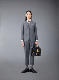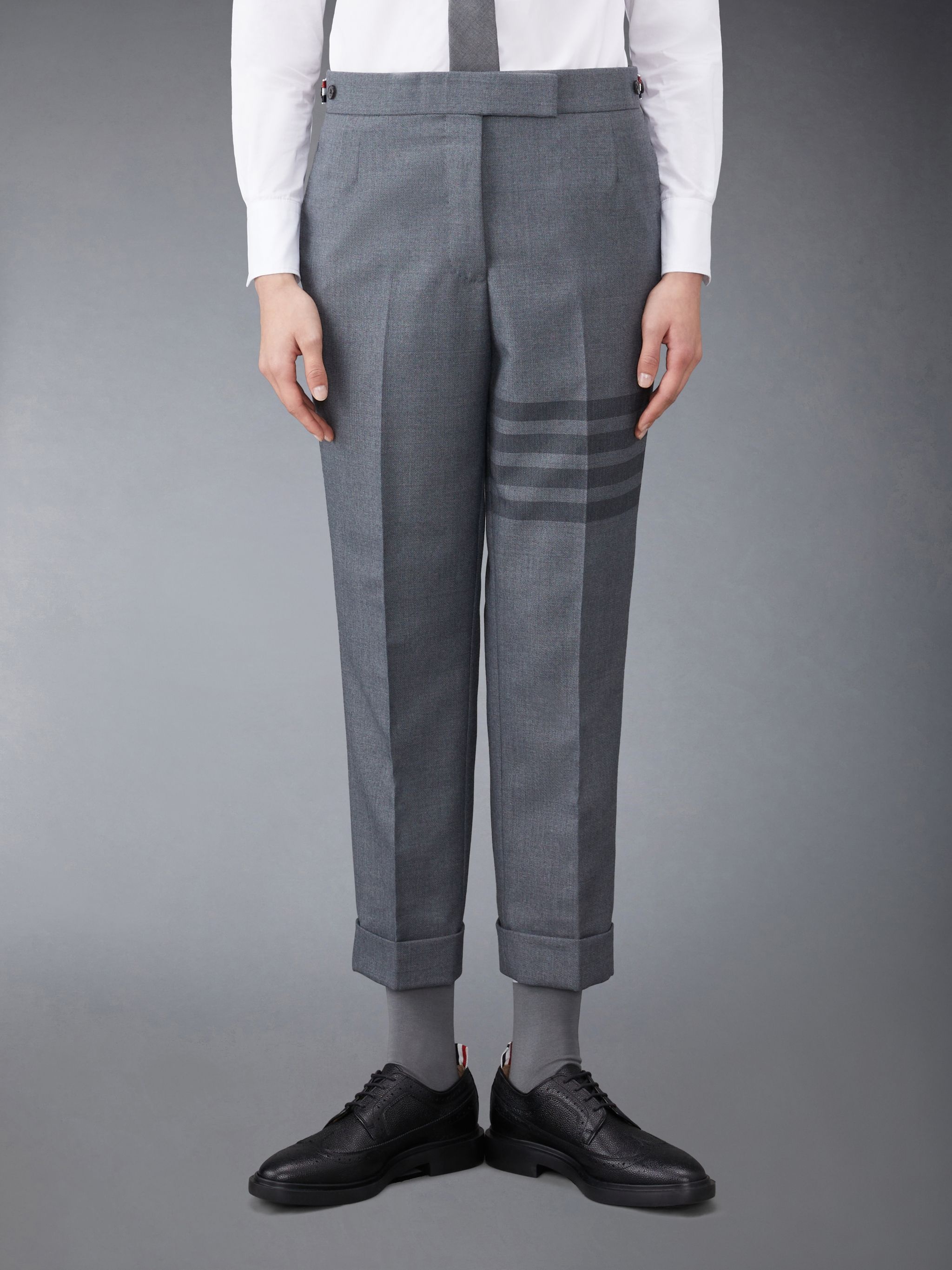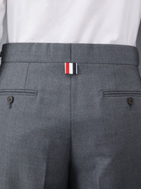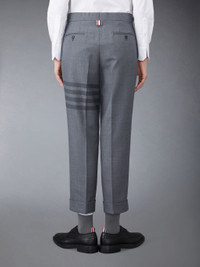 DETAILS & FIT At Thom Browne, uniformity is novel. Our School Uniform Twill School Uniform 4-Bar Low Rise Skinny Side Tab Trousers embraces a slim fit taken from punk influences while remaining true to Thom Browne's classic heritage. Tab front closure Adjustable buttoned waist strap 4-bar stripe detail Slip side pockets Button-fastening jetted hip pockets Signature striped grosgrain loop tab at back waist Model is 5' 10" (178cm), wearing size 40 50% Wool, 50% Polyester Lining: 100% Cupro Made in Italy FTC392A-04346-035