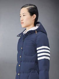 DETAILS & FIT The pinnacle of cold-weather sophistication — our Downfilled Ripstop 4-Bar Hooded Shirtdress. Signature Thom Browne emblems put a twist on fine winter wear. Front snap button closure Snap button cuffs Drawstring hood 4-bar stripe detail at left sleeve 3 front patch pockets Striped lining with interior pocket and name tag Name tag applique above hem Model is 5' 10" (178cm), wearing size 40 100% Polyester Combo1: 100% Polyester Padding: 80% White Goose Down, 20% White Goose Feathers Lining: 100% Polyester Made in Italy FOD025X-05222-415