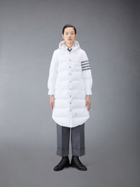 DETAILS & FIT The pinnacle of cold-weather sophistication — our Downfilled Ripstop 4-Bar Hooded Shirtdress. Signature Thom Browne emblems put a twist on fine winter wear. Front snap button closure Snap button cuffs Drawstring hood 4-bar stripe detail at left sleeve 3 front patch pockets Striped lining with interior pocket and name tag Name tag applique above hem Model is 5' 10" (178cm), wearing size 40 100% Polyester Combo1: 100% Polyester Padding: 80% White Goose Down, 20% White Goose Feathers Lining: 100% Polyester Made in Italy FOD025X-05222-100