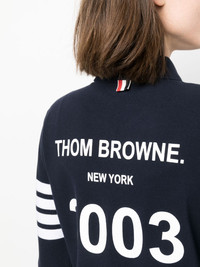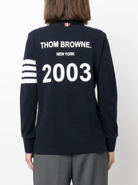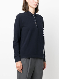 4-Bar long-sleeved polo shirt Crafted with a pique weave, this long-sleeved polo top from Thom Browne is decorated with the brand's signature 4-Bar stripe in white, constrasting against the piece's navy-blue background. Highlights - Navy blue - Signature 4-bar stripe - Polo collar - Front button placket - Long sleeves - Logo patch at the hem - Straight hem Made in Italy Composition Cotton 100% SIZE & FIT Model measurements Height 5 ft 10 in(1.77 m) Bust/Chest 35.03 in(89 cm) Hips 35.03 in(89 cm) Waist 23.62 in(60 cm)